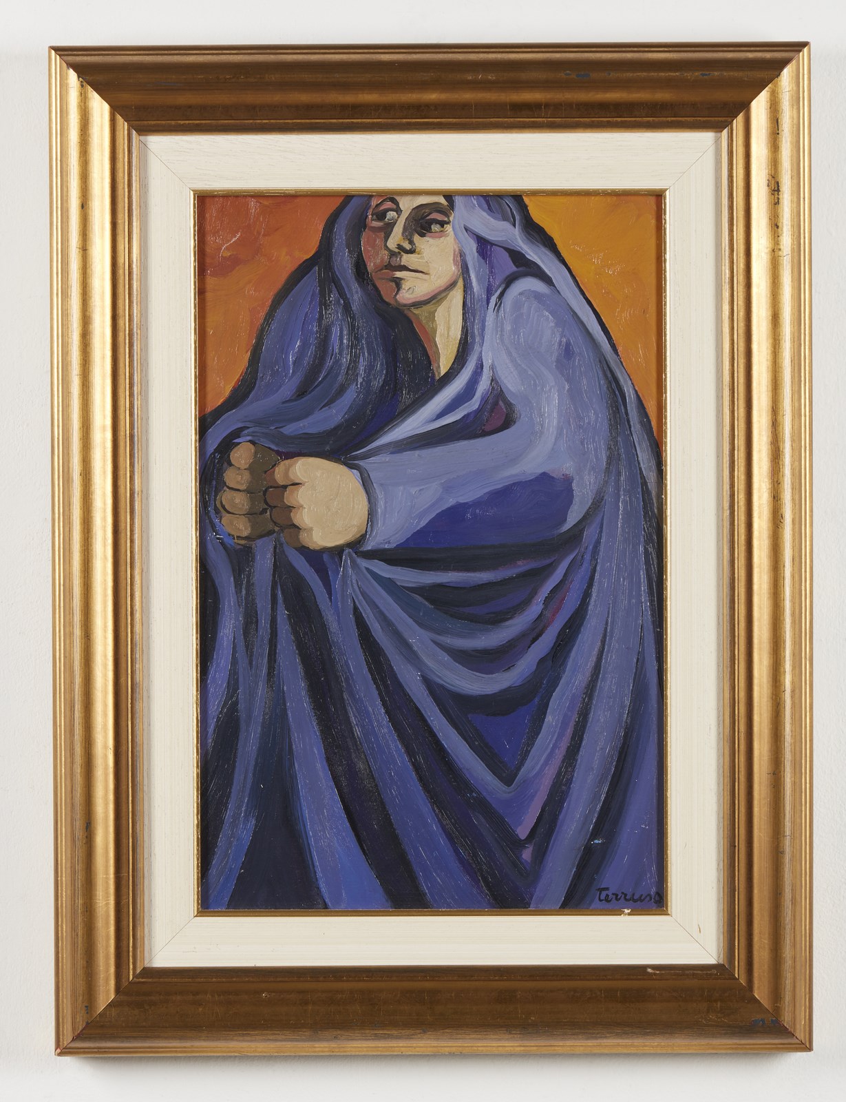 TERRUSO SAVERIO (1939 - 2003) Figura. Olio su tavola. Cm 33,00 x 50,00. Firma in basso a destra. Autentica su fotografia con relativo numero di inventario (tecnica sbagliata). Lievi difetti. . Cornice presente