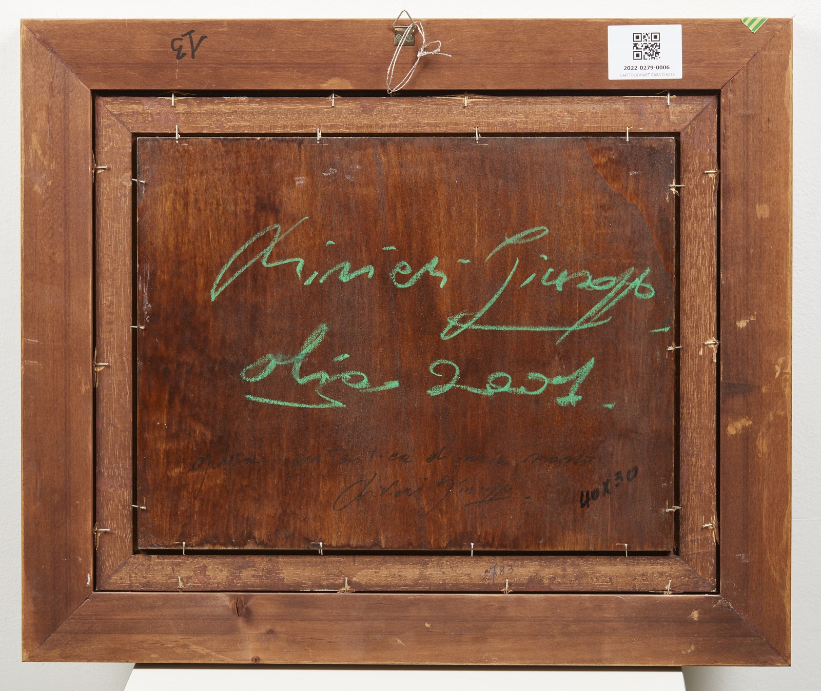 RIVIERI GIUSEPPE (n. 1953) Natura morta. 2001. Olio su carta applicata su tavola. Cm 30,00 x 40,00. Firma e anno in basso a sinistra. Al retro firma e anno. Lievi difetti. . Cornice presente