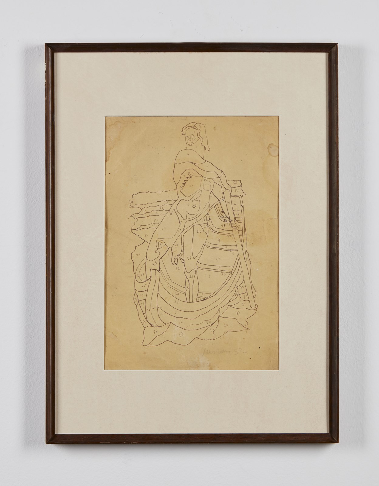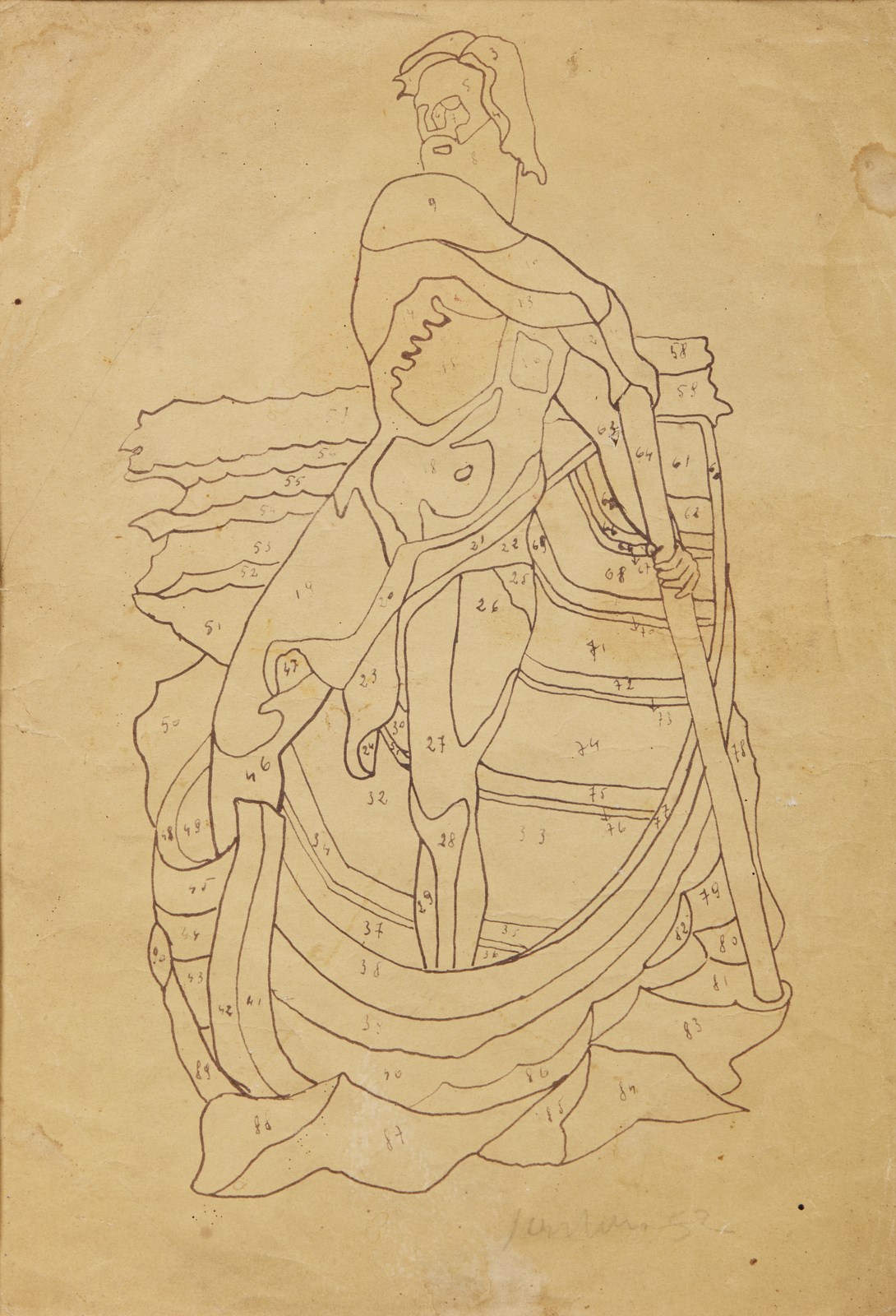 SARTORI AMLETO (1915 - 1962) Uomo che rema. 1952. Disegno su carta. Cm 21,50 x 31,00. Firma e anno in basso a destra. Disegno preparatorio per la realizzazione di un instarsio su legno. . Cornice presente