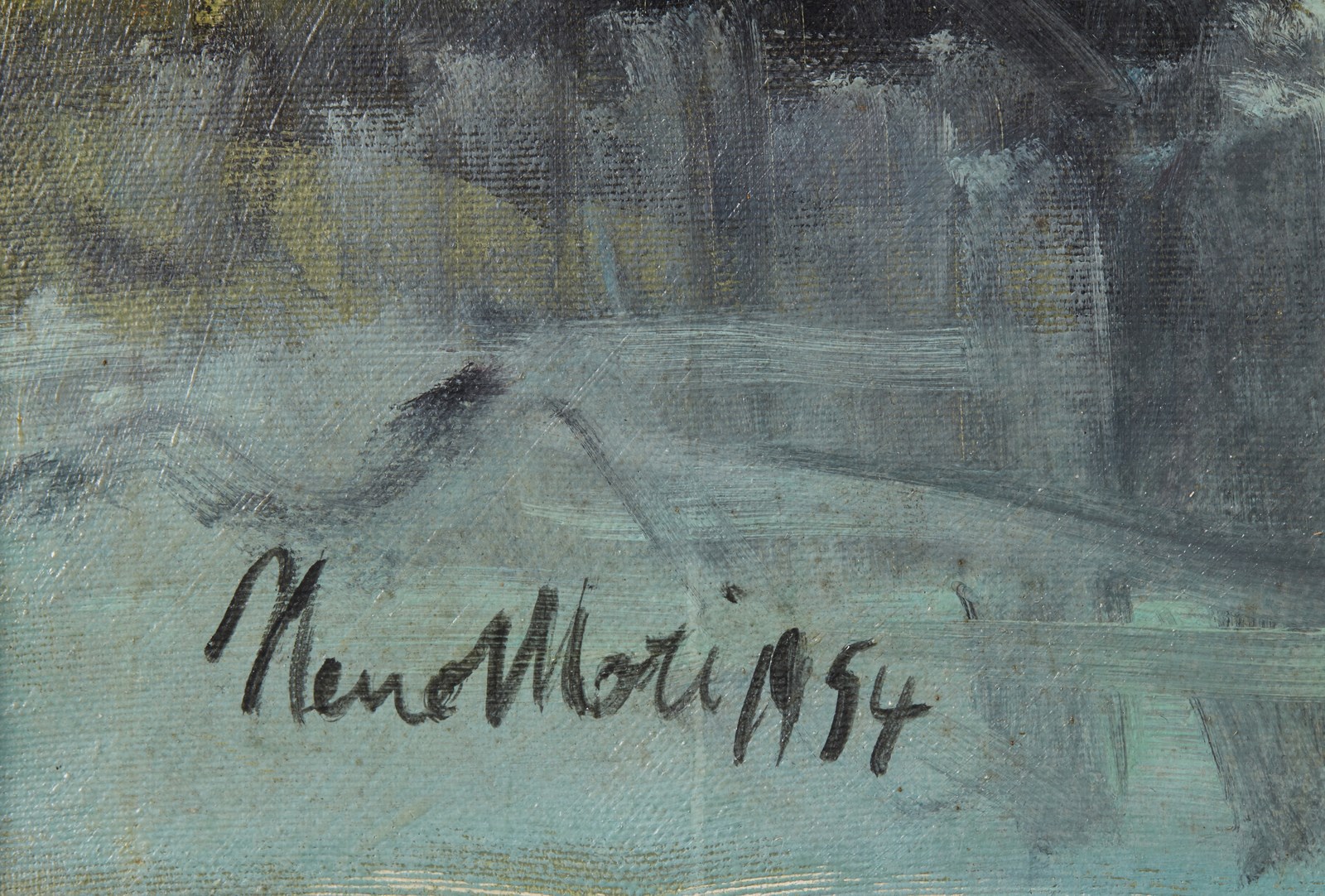 MORI NENO (1899 - 1968) Paesaggio. 1954. Olio su tela . Cm 50,00 x 70,00. Firma e anno in basso a sinistra. . Cornice presente