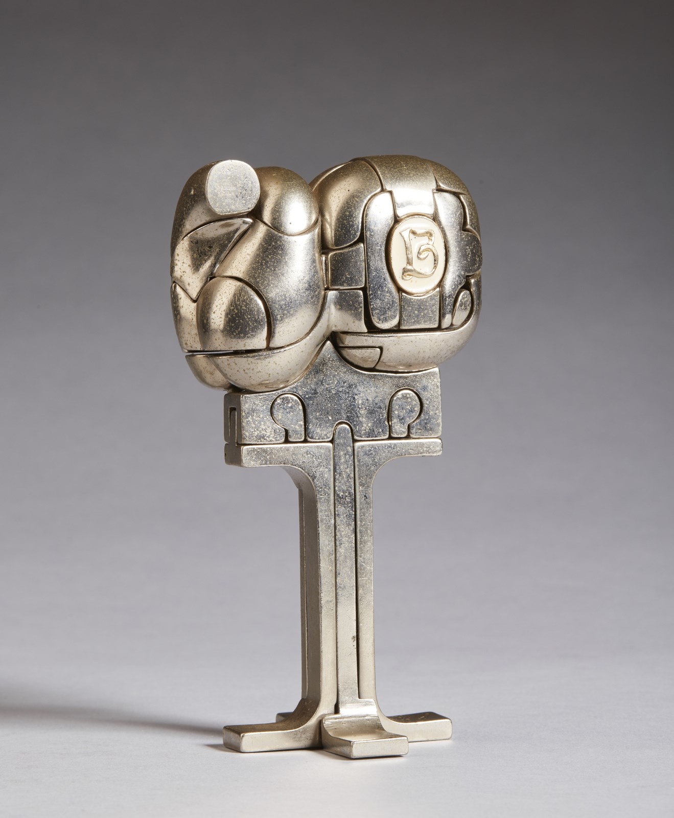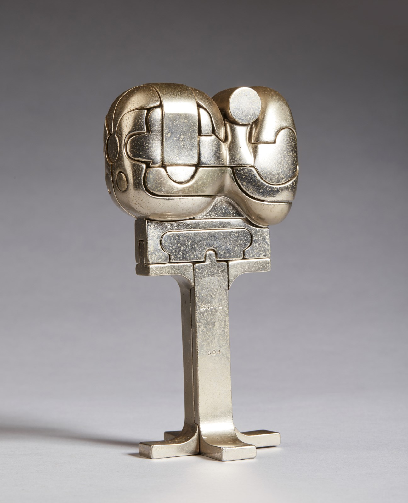 BERROCAL MIGUEL ORTIZ (1933 - 2006) Mini Cristina. . Scultura. Cm 8,10 x 15,20 x 6,00. 1969-1970. N.604. Tiratura e firma incise alla base. Dalla serie Micro - Multiples: scultura smontabile composta da 25 elementi, uno dei quali consiste in un anello. Edizione totale: A) Edizione di Lusso: realizzata in cera persa, comprende: 6 esemplari in oro fino, a 18k, marchiati con un punzone riservato esclusivamente ai pezzi in oro numerati da 1 a 6 e muniti del certificato di autenticità. Nell'anello è incastonata una pietra preziosa + 500 esemplari in argento massiccio, firmati e numerati da 1 a 500. B) Edizione normale: In questa edizione gli elementi formanti la scultura, che vanno da n.14 al 25, sono stati modificati. La scultura che ne risulta ha le seguenti dimensioni: 9.6x6.2x3.7 cm. Gli esemplari sono stati realizzati ad iniezione e l'edizione comprende: 9500 esemplari in metallo nichelato firmati e numerati + n. illimitato di esemplari in materia plastica opaca. Lievi difetti.