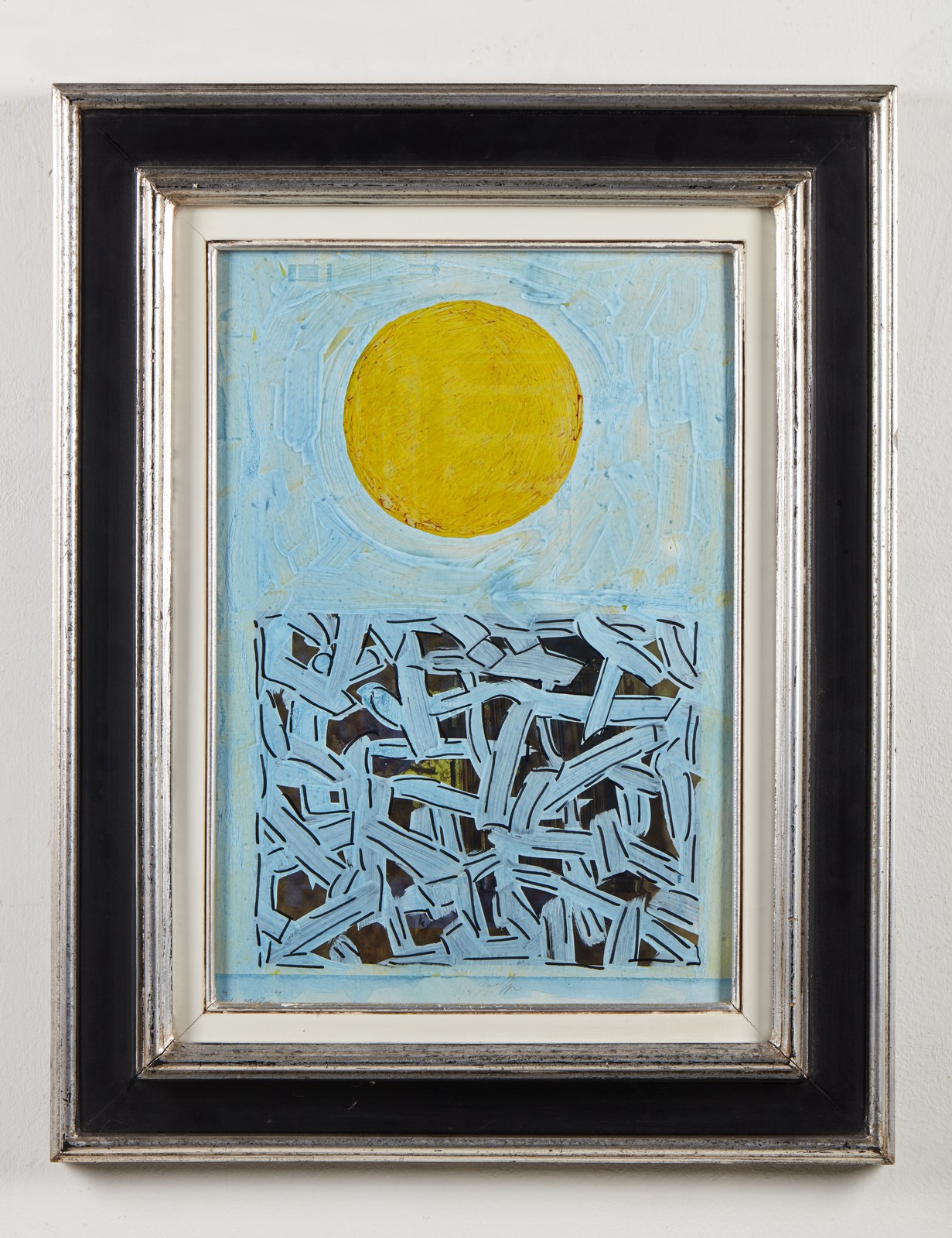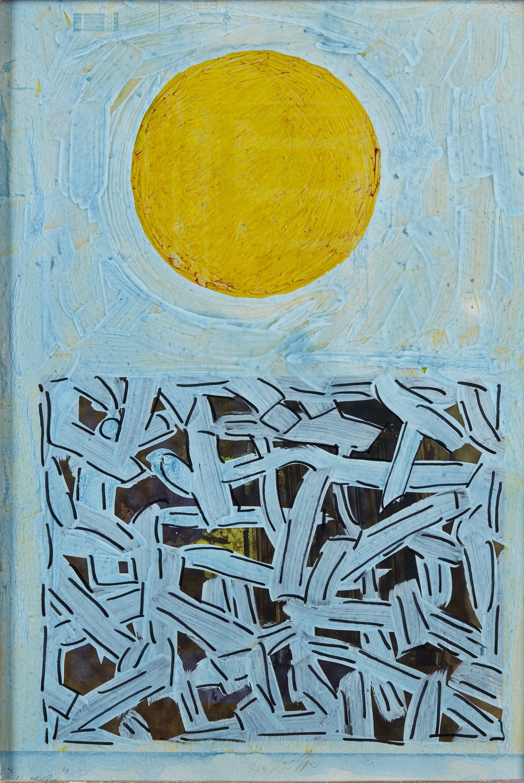 DANGELO SERGIO (n. 1932) Il muro. Tecnica mista su carta. Cm 34,00 x 49,00. Titolo e firma in basso. Autentica dell'artista su fotografia. Lievi difetti. . Cornice presente