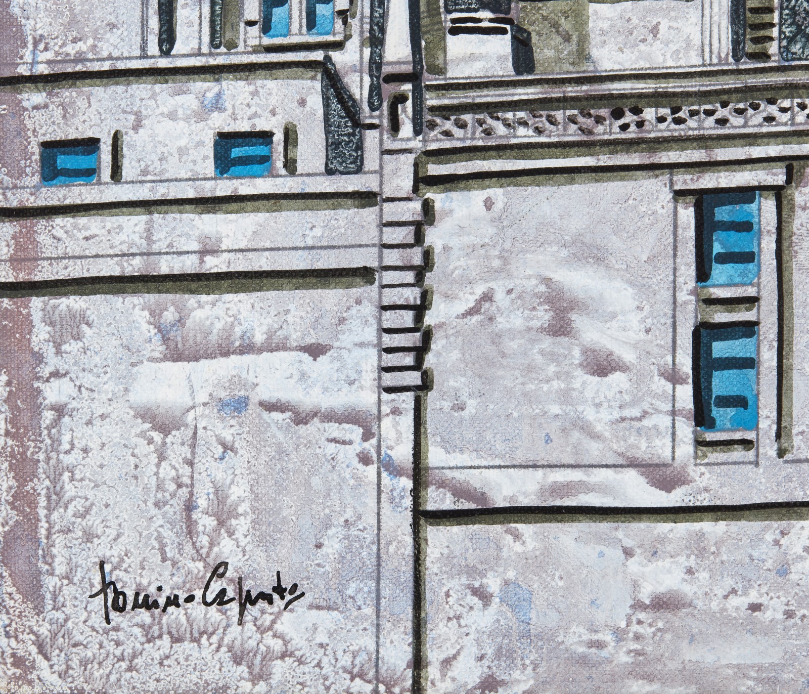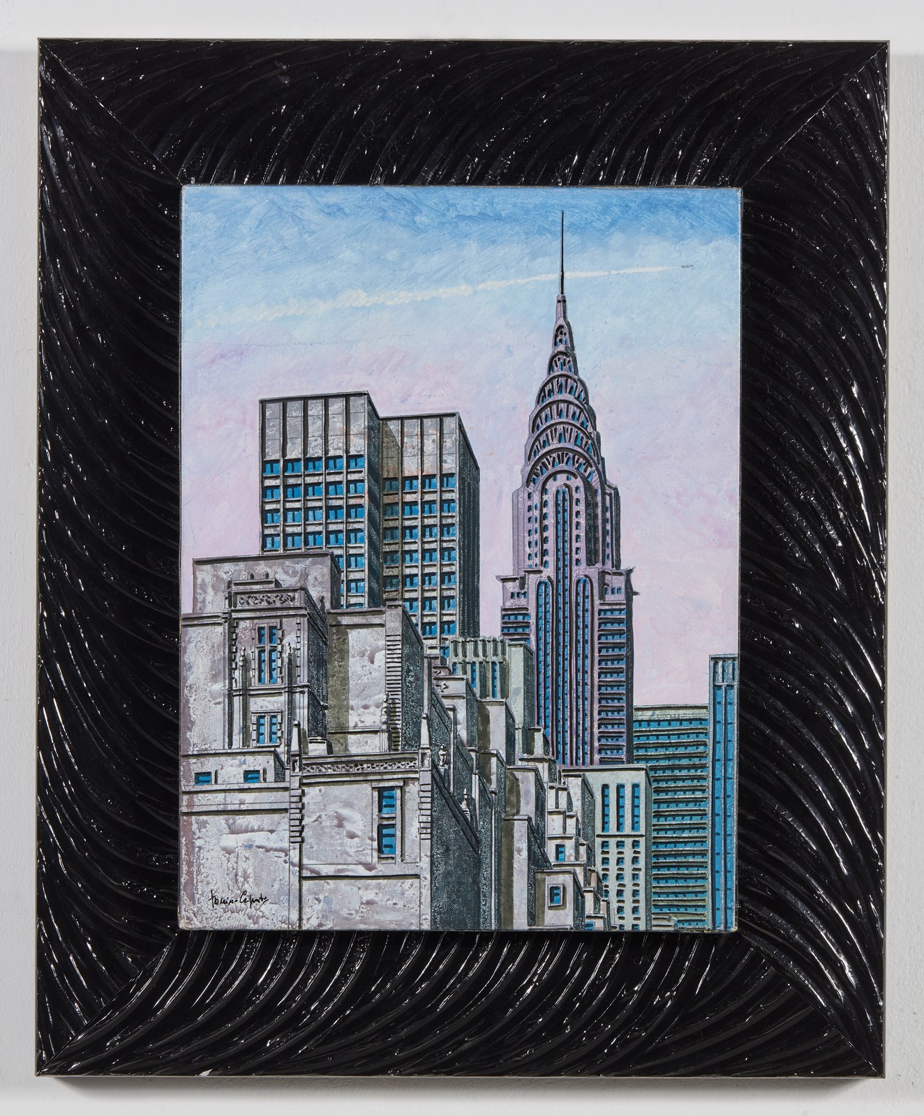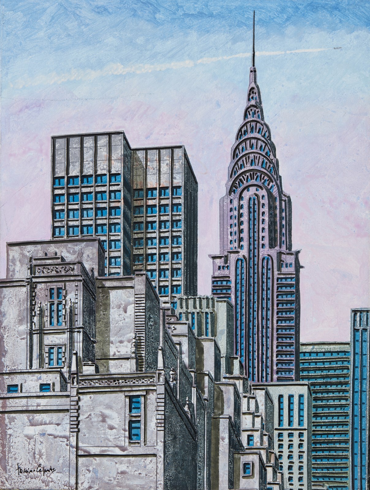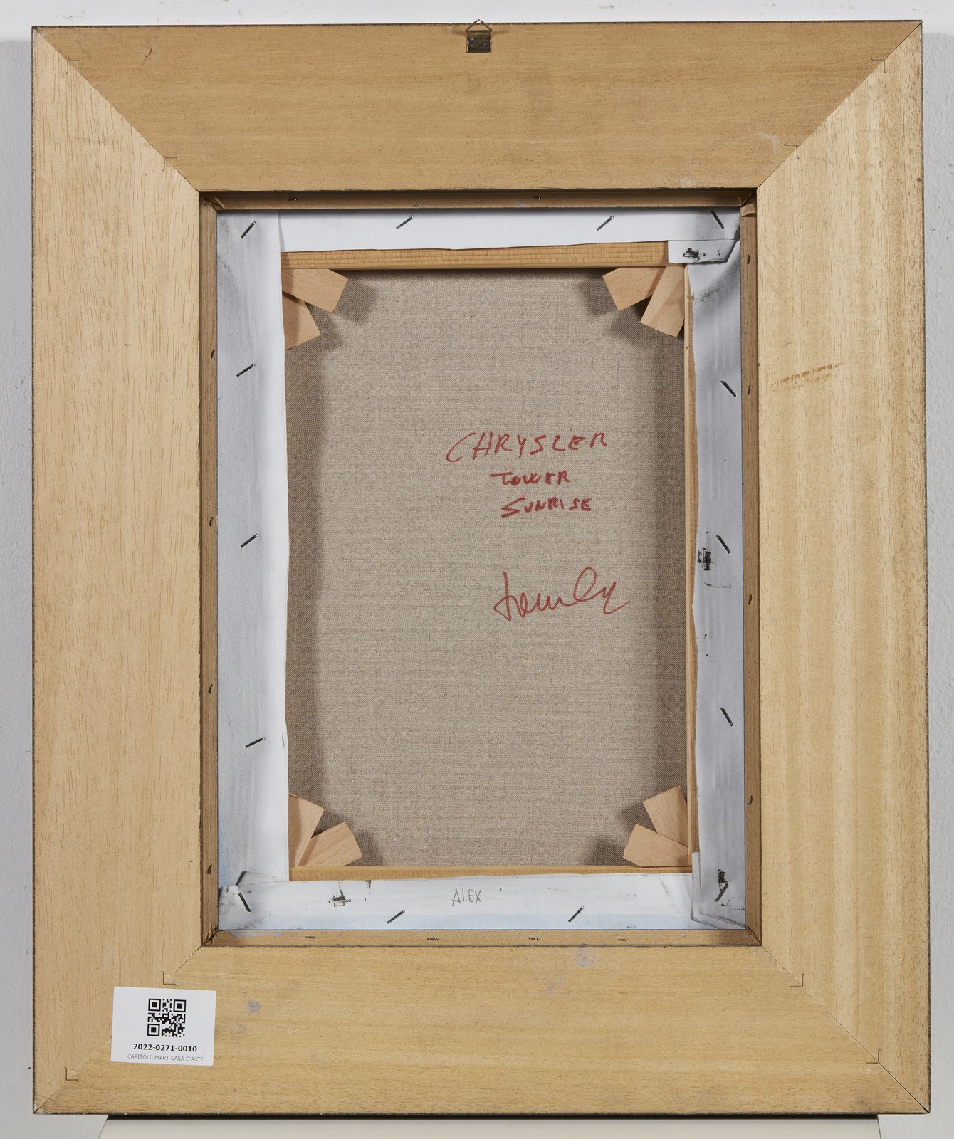 CAPUTO TONINO (n. 1933) Chrysler tower sunrise. Olio su tela . Cm 30,00 x 40,00. Firma in basso a sinistra. Al retro firma e titolo. Autentica dell'artista su fotografia. Certificato di garanzia Artesegno, Udine. Lievi difetti. . Cornice presente