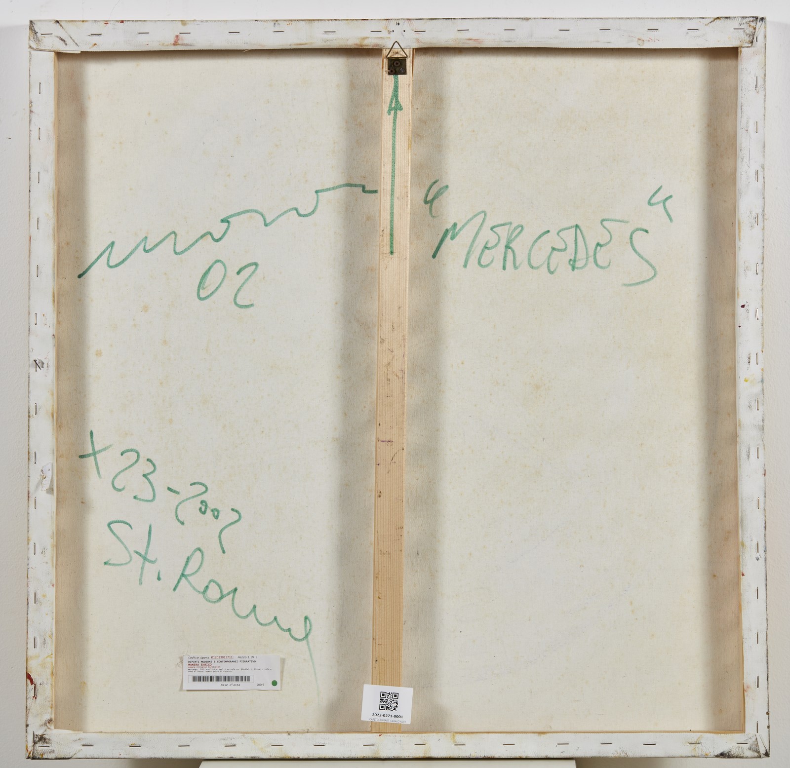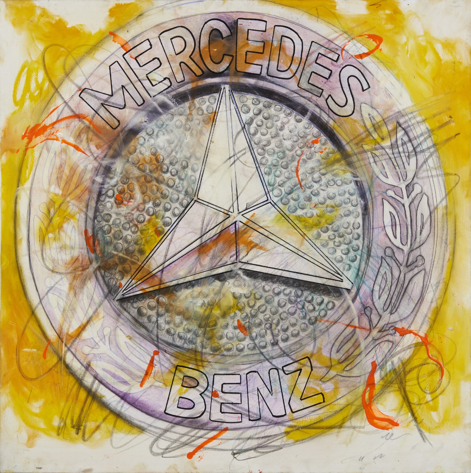MANERA ENRICO (n. 1947) Mercedes. 2002. Tecnica mista su tela. Cm 80,00 x 80,00. Al retro titolo, firma e anno. Autentica dell'artista su fotografia. Certificato di provenienza Meeting Art, Vercelli. Difetti.