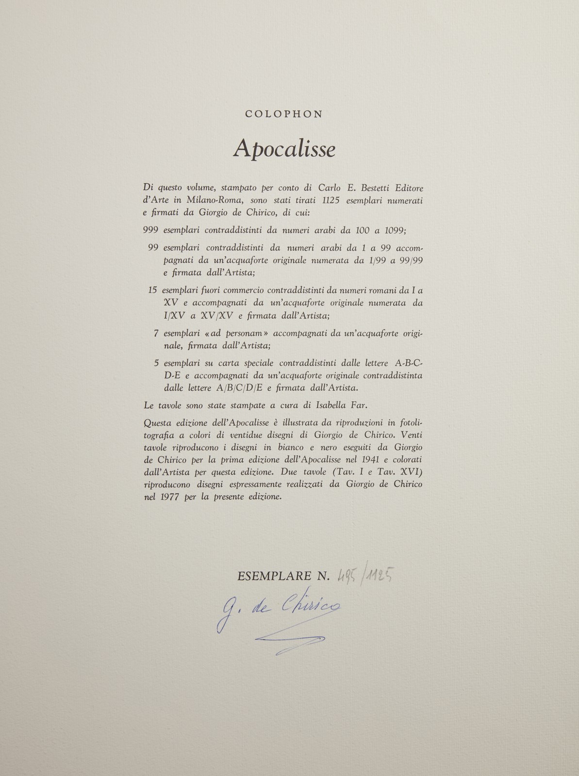 DE CHIRICO GIORGIO (1888 - 1978) L'apocalisse. Fotolitografia. Cm 42,00 x 54,00 x 8,00. 495/1125. Tiratura a matita e firma a penna sul colophon. Di questo volume stampato per conto di Carlo E. Bestetti Editore d'arte, sono stati tirati 1125 esemplari numerati e firmati dall'artista, di cui: 999 esemplari numerati da 100 a 1099; 99 esemplari numerati da 1 a 99 accompagnati da un'acquaforte numerata da 1/99 a 99/99 e firmata dall'artista; 15 esemplari fuori commercio numerati da I a XV e accompagnati da un'acquaforte numerata da I/XV a XV/XV e firmata dall'artista; 7 esemplari ad personam; 5 esemplari su carta speciale contraddistinti dalle lettere A/B/C/D/E accompagnati da un'acquaforte firmata dall'artista. Le tavole sono state stampate da Isabella Far. Questa edizione dell'Apocalisse è illustrata con riproduzioni fotolitogrfiche di 22 disegniu di G. De Chirico. Venti tavole riproducono i disegni eseguiti da Giorgio De Chirico per la prima edizione dell'Apocalisse del 1941. Due tavole riproducono disegni espressamente realizzati dall'artista, nel 1977, per la presente edizione. Difetti.