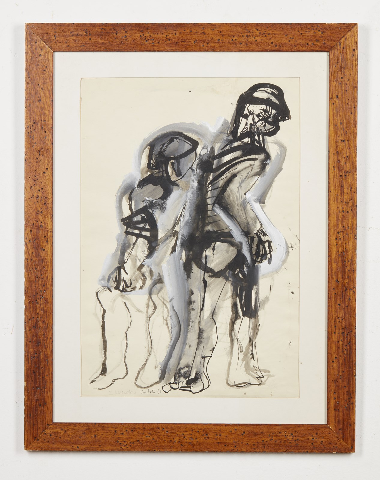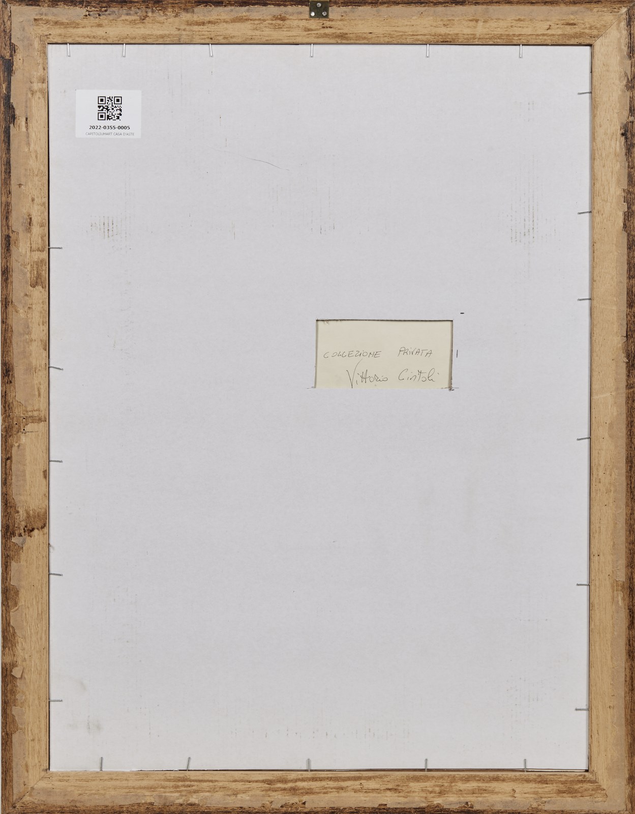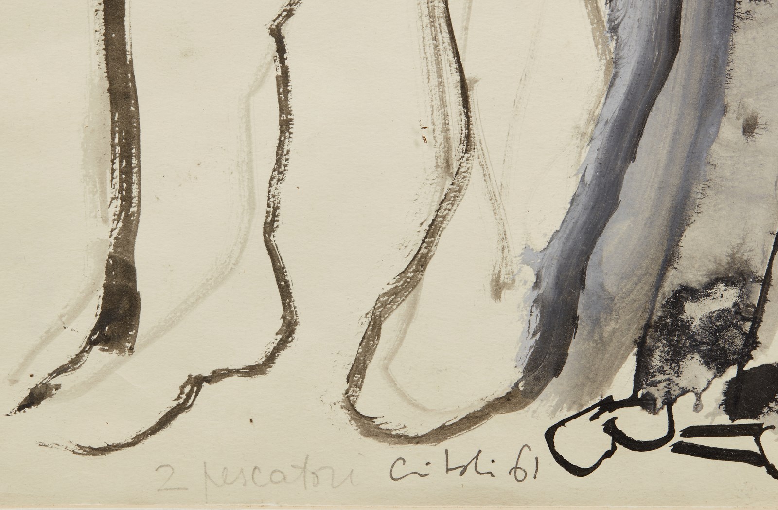 CINTOLI CLAUDIO (1935 - 1978) Due pescatori. 1961. Tecnica mista su carta. Cm 43,70 x 58,50. Titolo, firma e anno in basso a sinistra. Autentica su fotografia di Vittorio Cintoli. Difetti. . Cornice presente