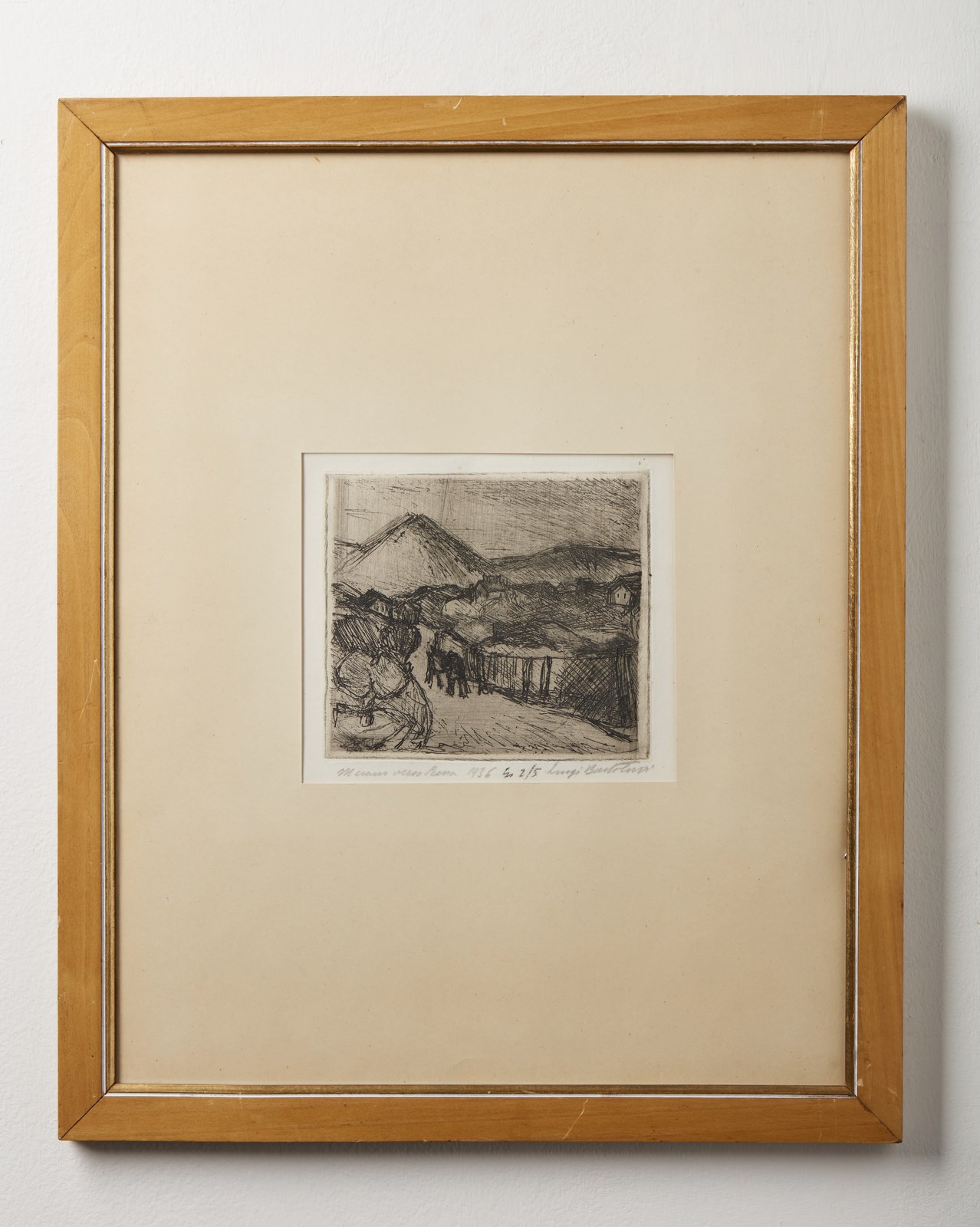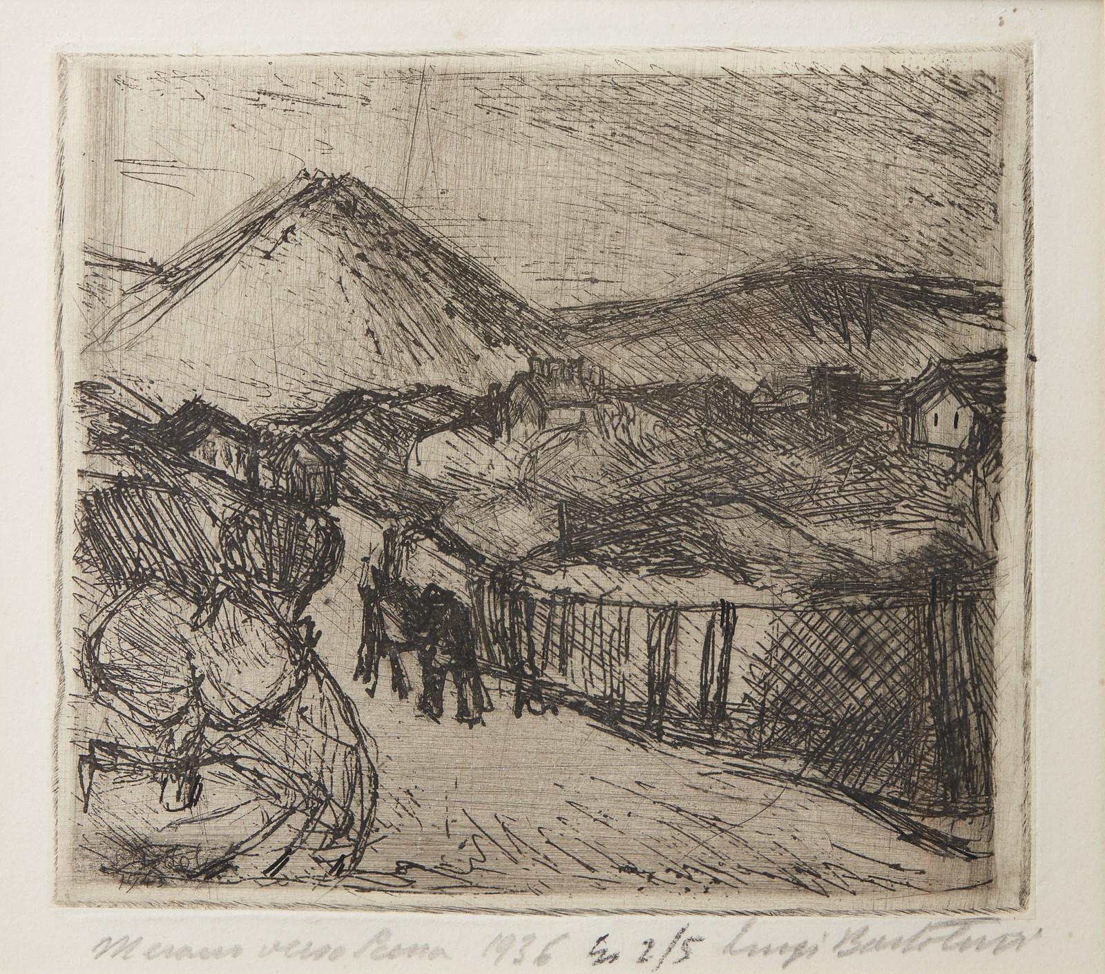 BARTOLINI LUIGI (1892 - 1963) Paese di Parcines. 1943. Acquaforte. Cm 23,20 x 21,20. 2/5. Tiratura e firma in basso a matita. Anno in lastra in basso a sinistra. Dimensione lastra: 13,3x15,2cm. La grafica è stata titolata anche Il Fattore. Si tratta di una diversa versione dell’acquaforte Campagna meranese, pubblicata (https://www.luigibartolini.com/campagna_meranese_70.html). La data indicata a matita prima della tiratura è errata.Si ringrazia l'archivio Luigi Bartolini per aver confermato l'autenticità dell'opera. . Cornice presente