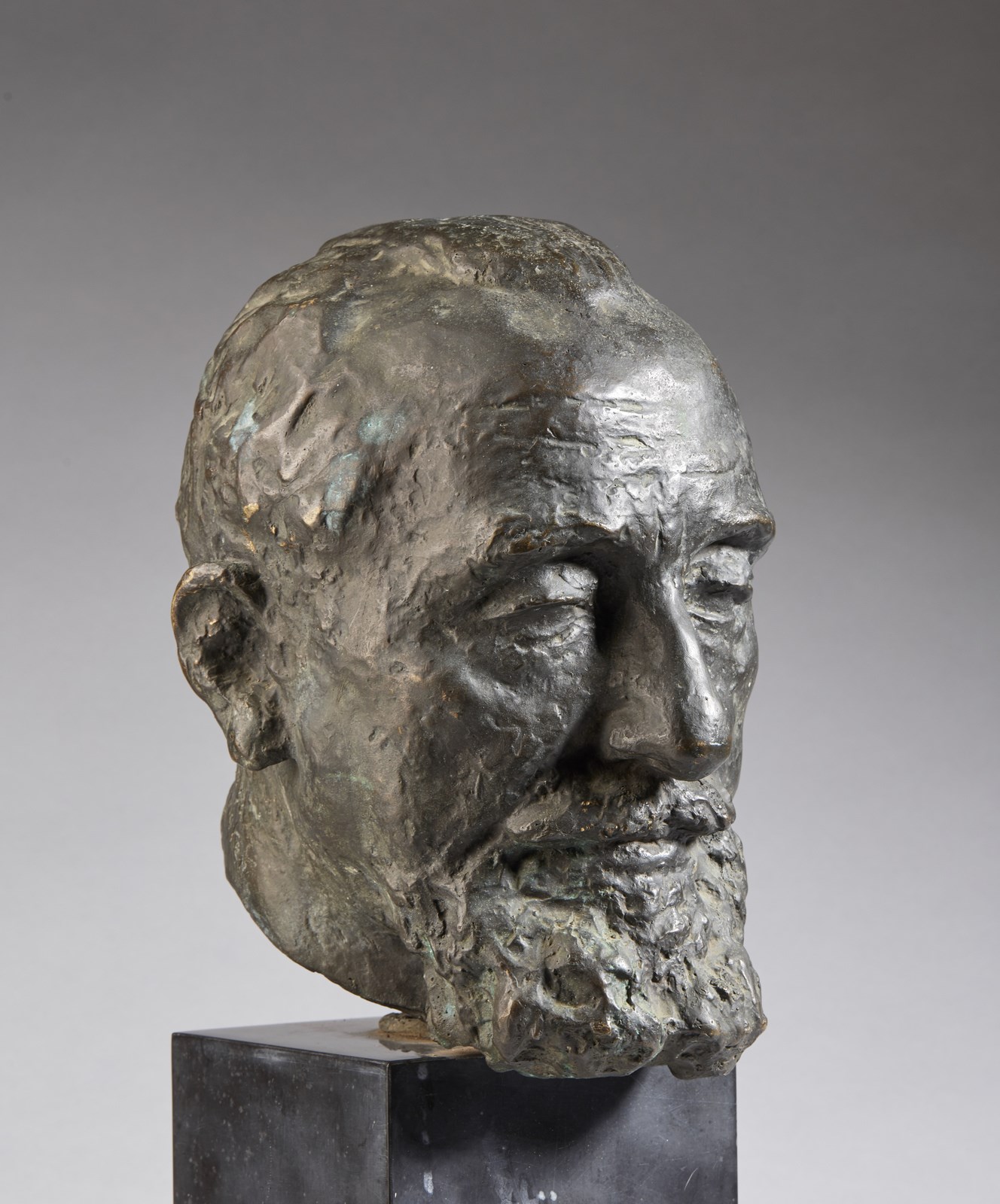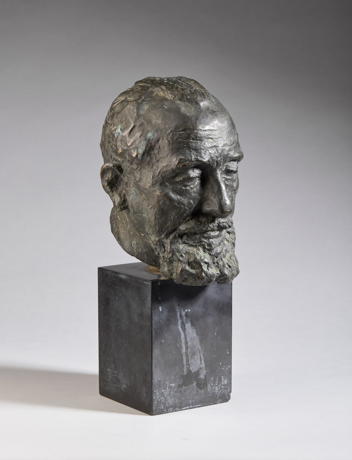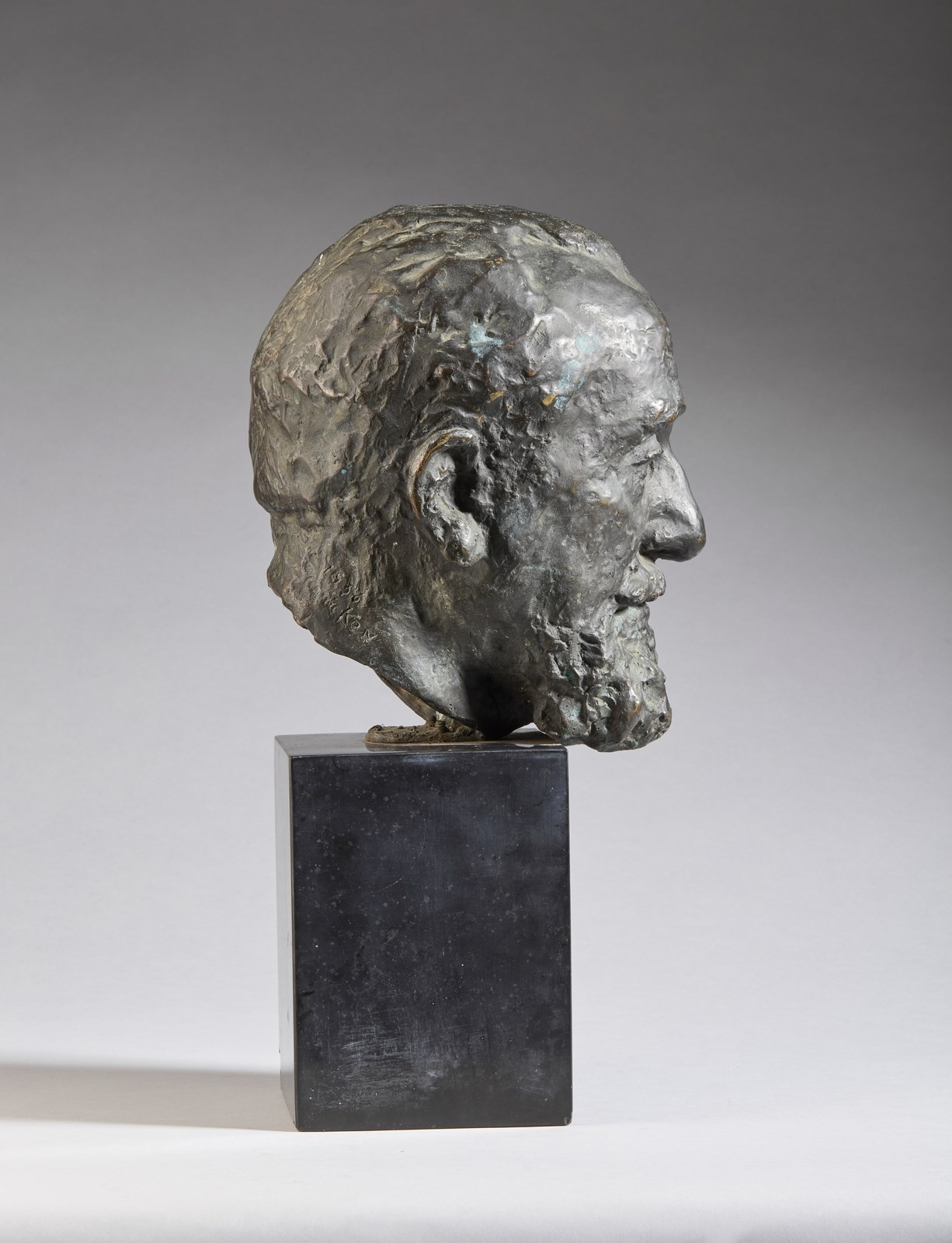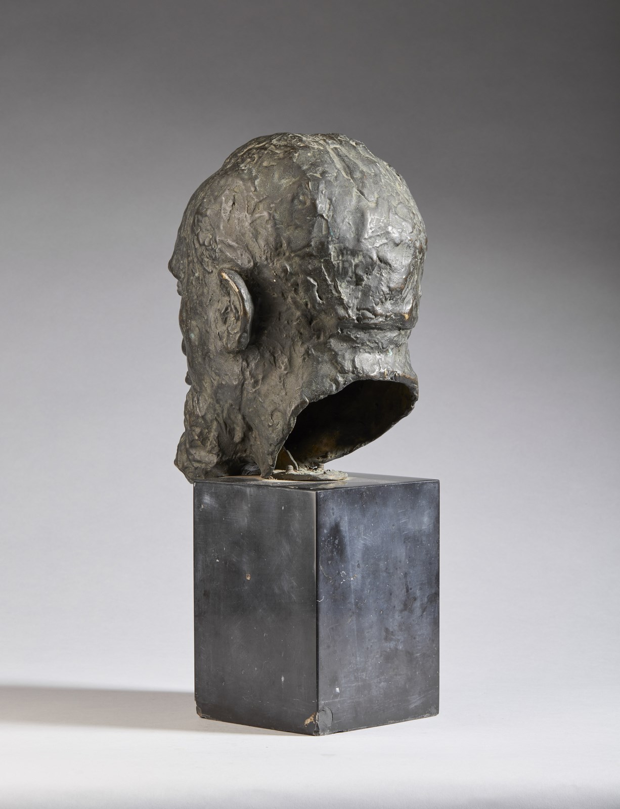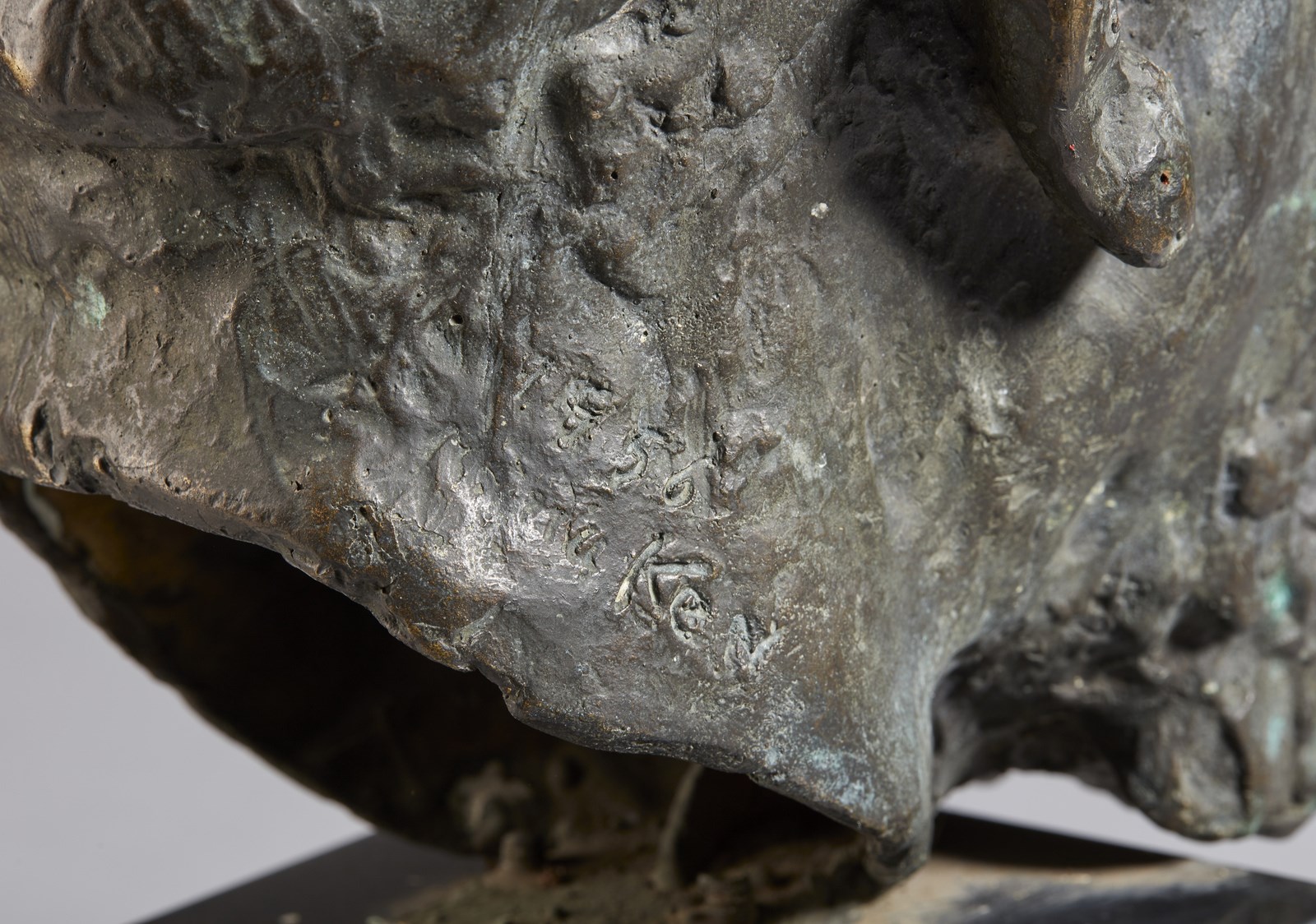 AUTORE NON IDENTIFICATO Testa d'uomo. Bronzo. Cm 20,50 x 30,50 x 24,00. Firmato e datato sul lato. Dimensioni con la base: 49,5x20,5x24cm. Difetti.