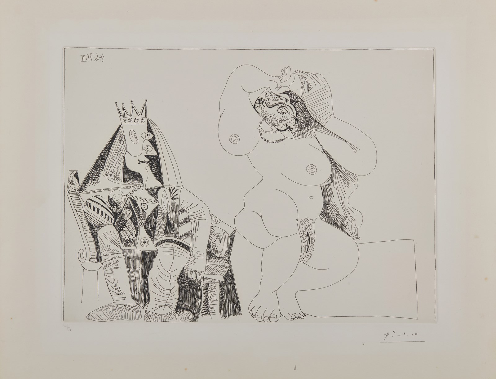 PICASSO PABLO (1881 - 1973) Salomé dansant pour Hérode. . 1971. Acquaforte. Cm 65,70 x 50,70. 41/50. Tiratura in basso a sinistra e firma a stampa in basso a destra. Dimensioni lastra: 36,5x49,5 cm. Dalla Suite 156: l'ultima serie che Picasso incise tra il 1970 e 1972. Le grafiche furono esposte alla Galleria Loise Leiris, Gennaio - Febbraio 1973. Carta Rivers. Lievi difetti.