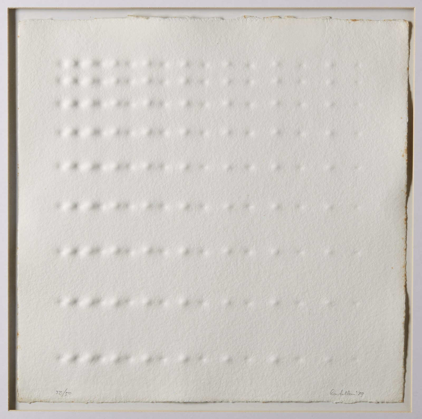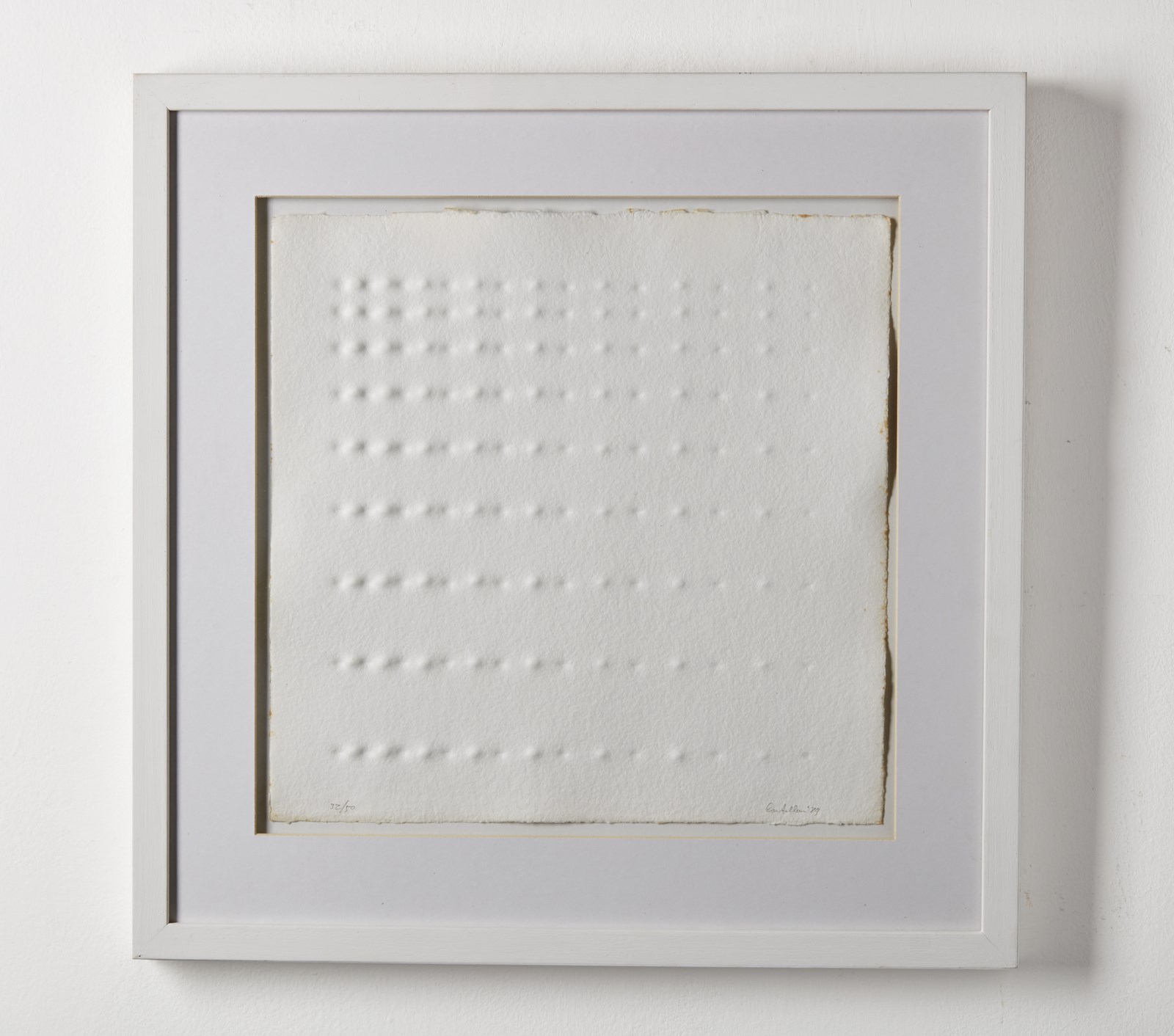 CASTELLANI ENRICO (1930 - 2017) Rilievo bianco,. 1979. Calcografia. Cm 34,00 x 34,00. 32/50. Tiratura, firma e anno in basso a matita. Edizione totale: 50 esemplari numerati da 1/50 a 50/50. Stampatore e editore Atelier Lafranca, Locarno. Pubblicazione: L'opera grafica di Enrico Castellani 1960-1995. Corraini Edizioni,1996, n.29. Lievi difetti. . Cornice presente