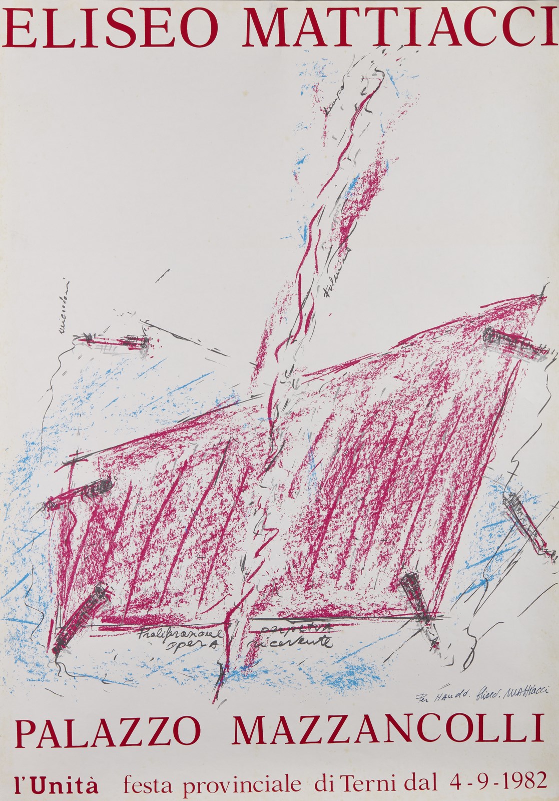 MATTIACCI ELISEO (n. 1940) Senza titolo. . 1982. Poster. Cm 68,50 x 97,00. Firma e dedica in basso a destra a penna. Manifesto dell'esposizione tenutasi presso Palazzo Mazzancolli, Terni. Lievi difetti.