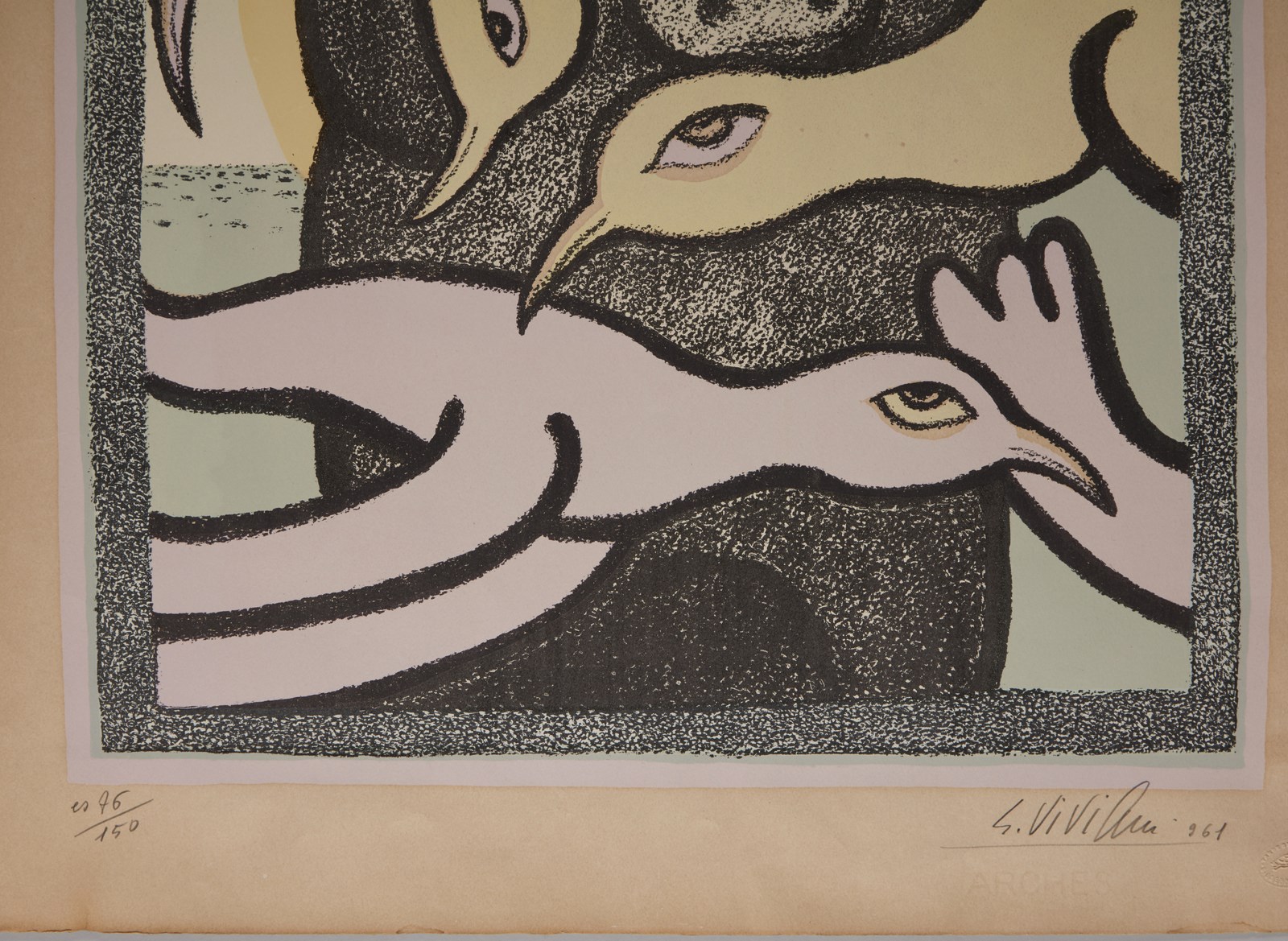 VIVIANI GIUSEPPE (1898 - 1965) Cane e gabbiani. 1961. Litografia. Cm 56,00 x 76,50. 76/150. Tiratura, firma e anno in basso a matita. Timbro a secco Tarde sud tuto Giiuseppe Viviani in basso a destra. Difetti.