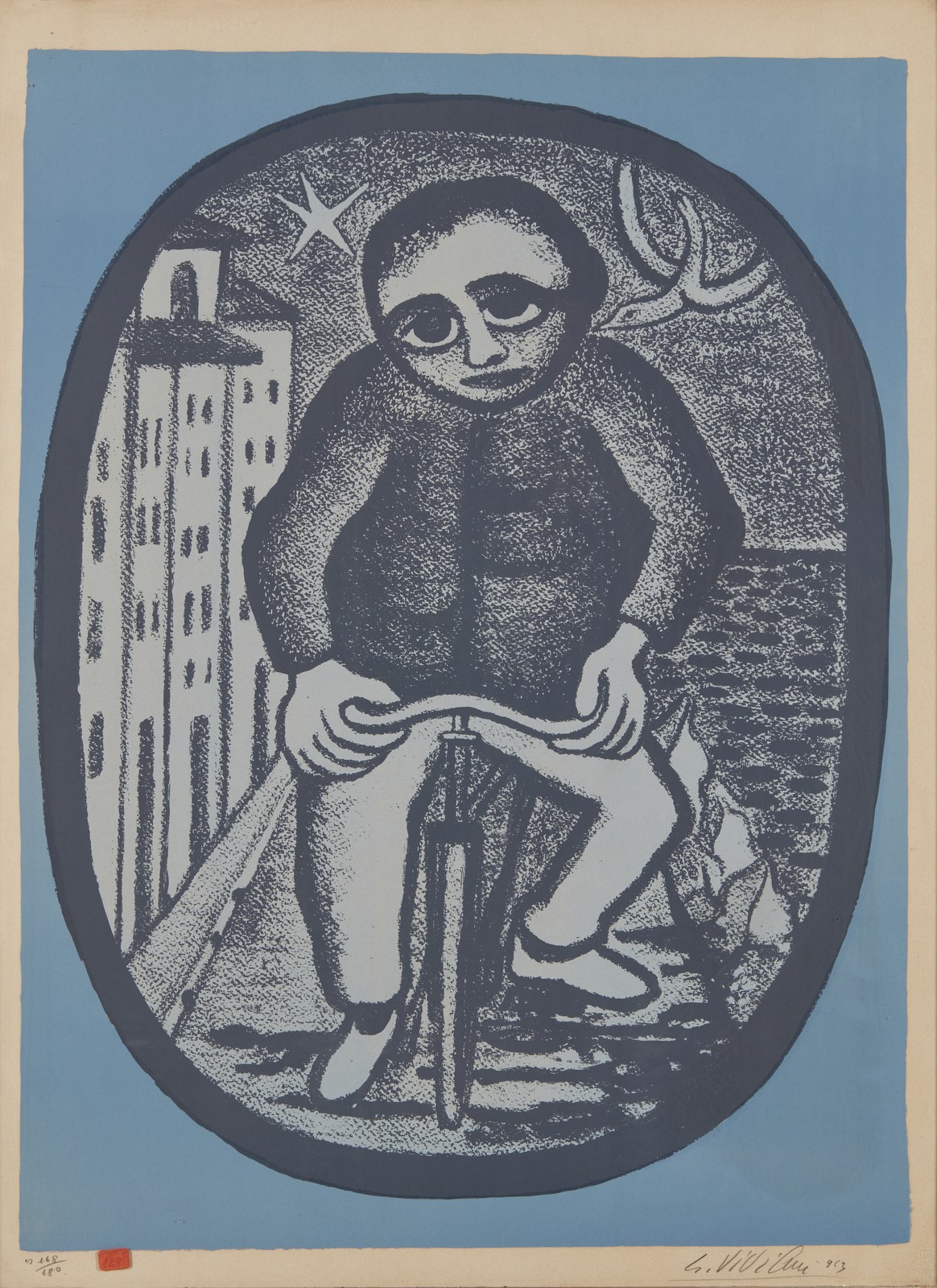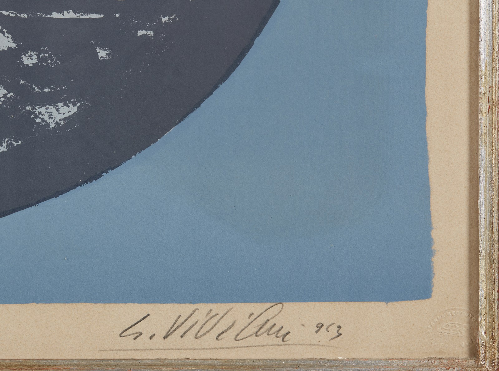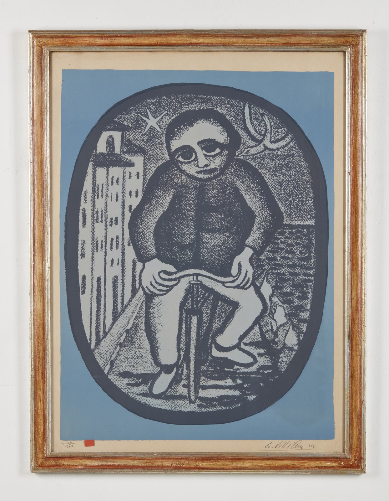 VIVIANI GIUSEPPE (1898 - 1965) Uomo in bici. 1963. Litografia. Cm 57,00 x 77,00. 168/180. Tiratura, firma e anno in basso a matita. Timbro a seccoTarde sud tuto Giuseppe Viviani in basso a destra. Lievi difetti. . Cornice presente