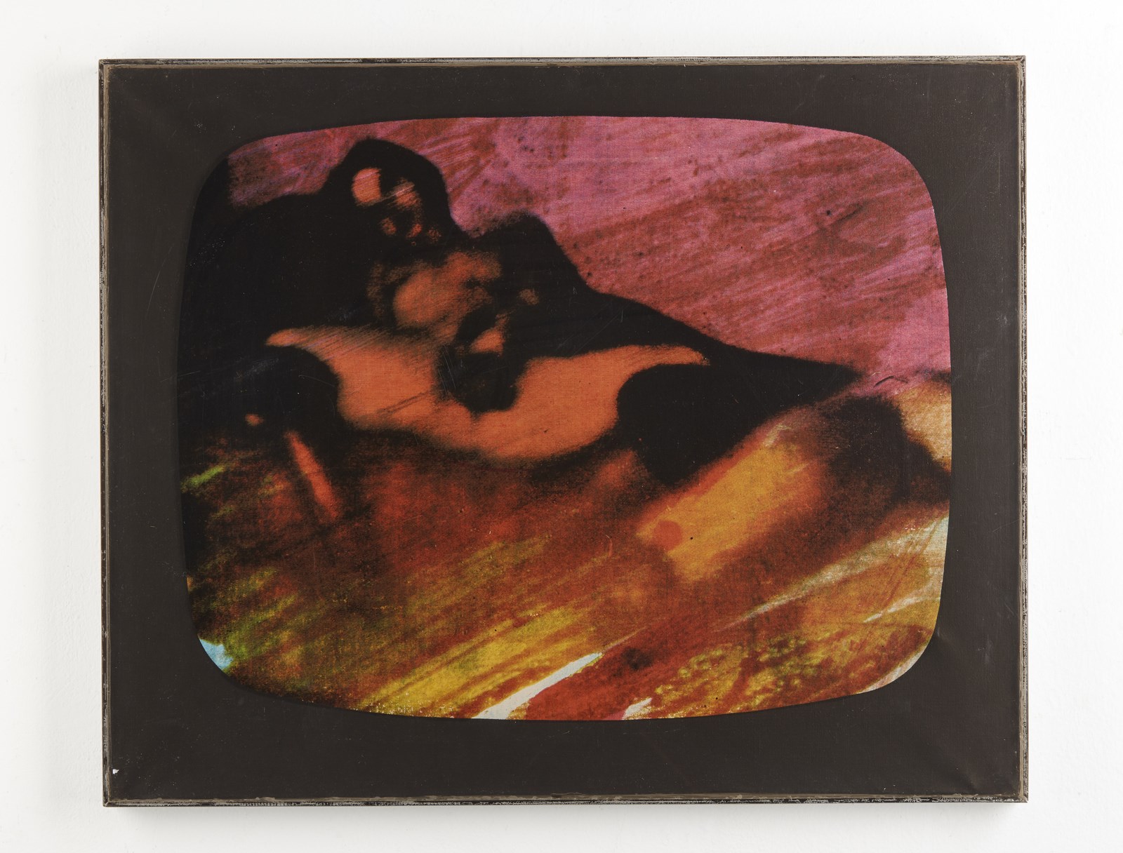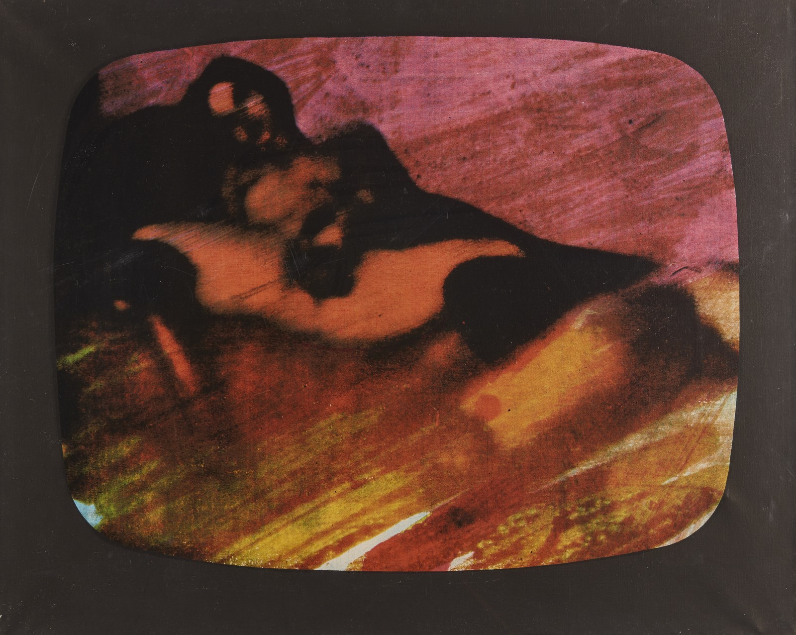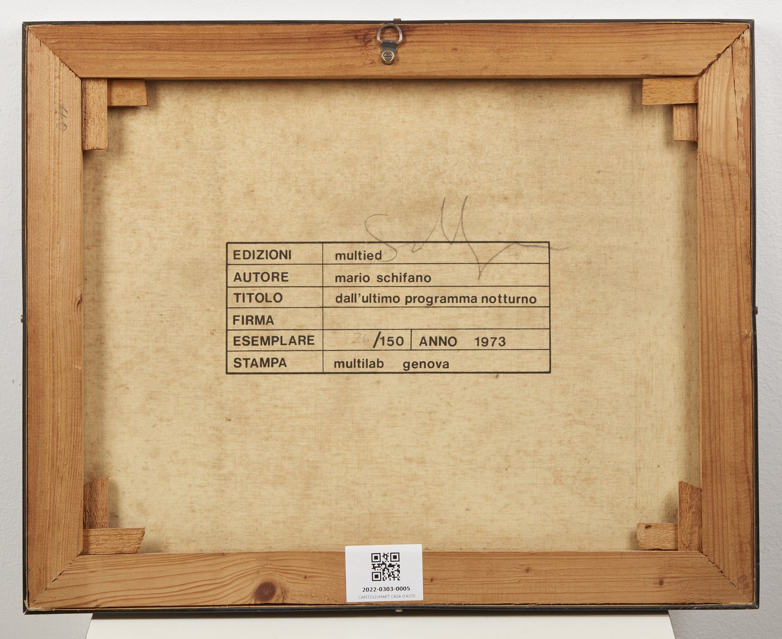 SCHIFANO MARIO (1934 - 1998) Dall'ultimo programma notturno. 1973. Serigrafia su tela. Cm 40,00 x 30,00. 26/150. Tiratura e firma al retro. Edizioni Multied. Stampa Multilab Genova. Lievi difetti. . Cornice presente