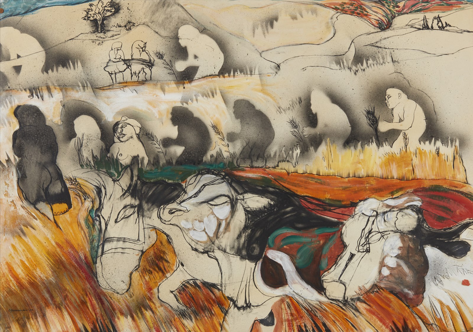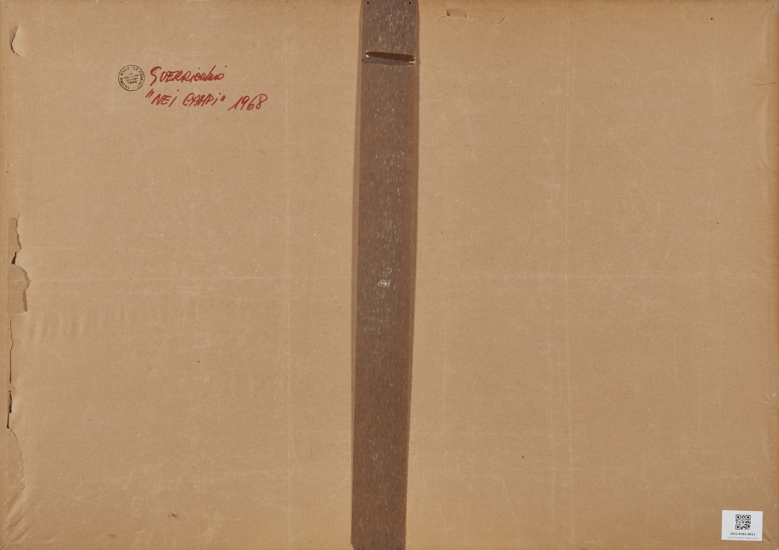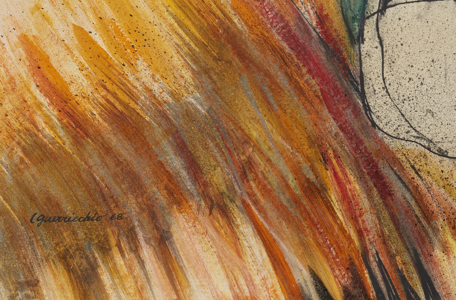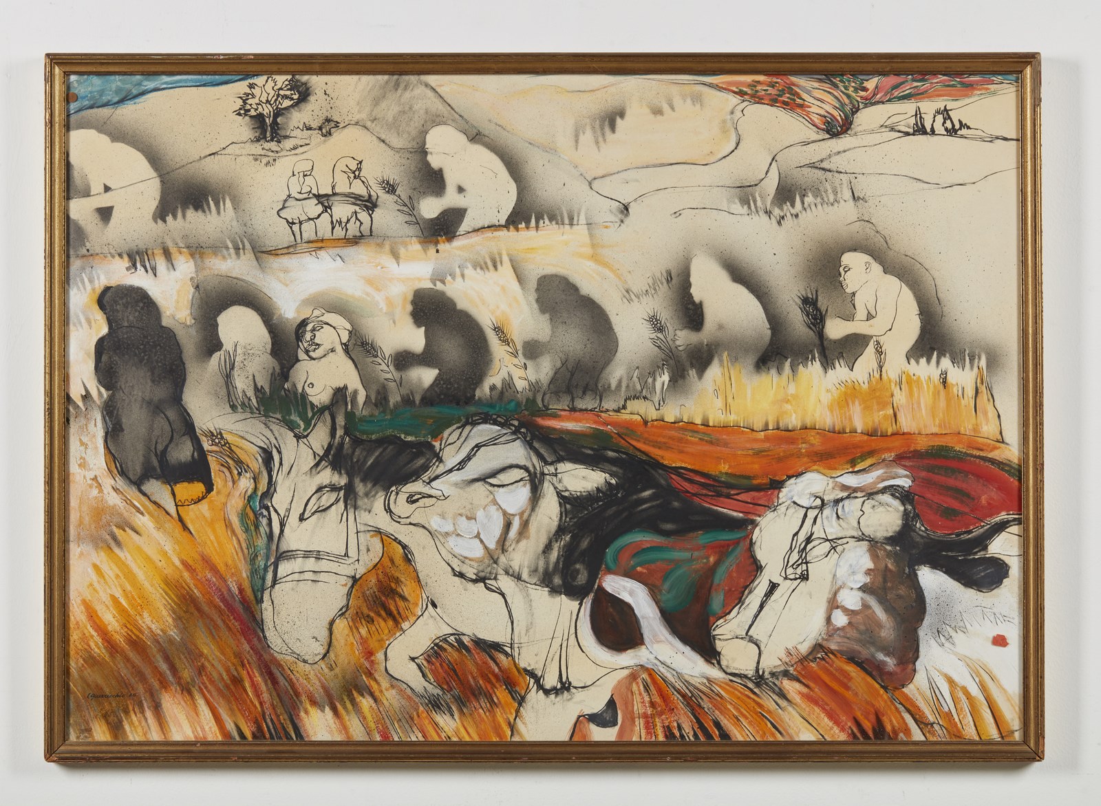 GUERRICCHIO LUIGI (1932 - 1996) Nei campi. Tecnica mista su carta. Cm 100,00 x 70,00. Firma e anno in basso a sinistra. Al retro firma, titolo, anno e timbro Galleria d'Arte La Piramide. Lievi difetti. . Cornice presente
