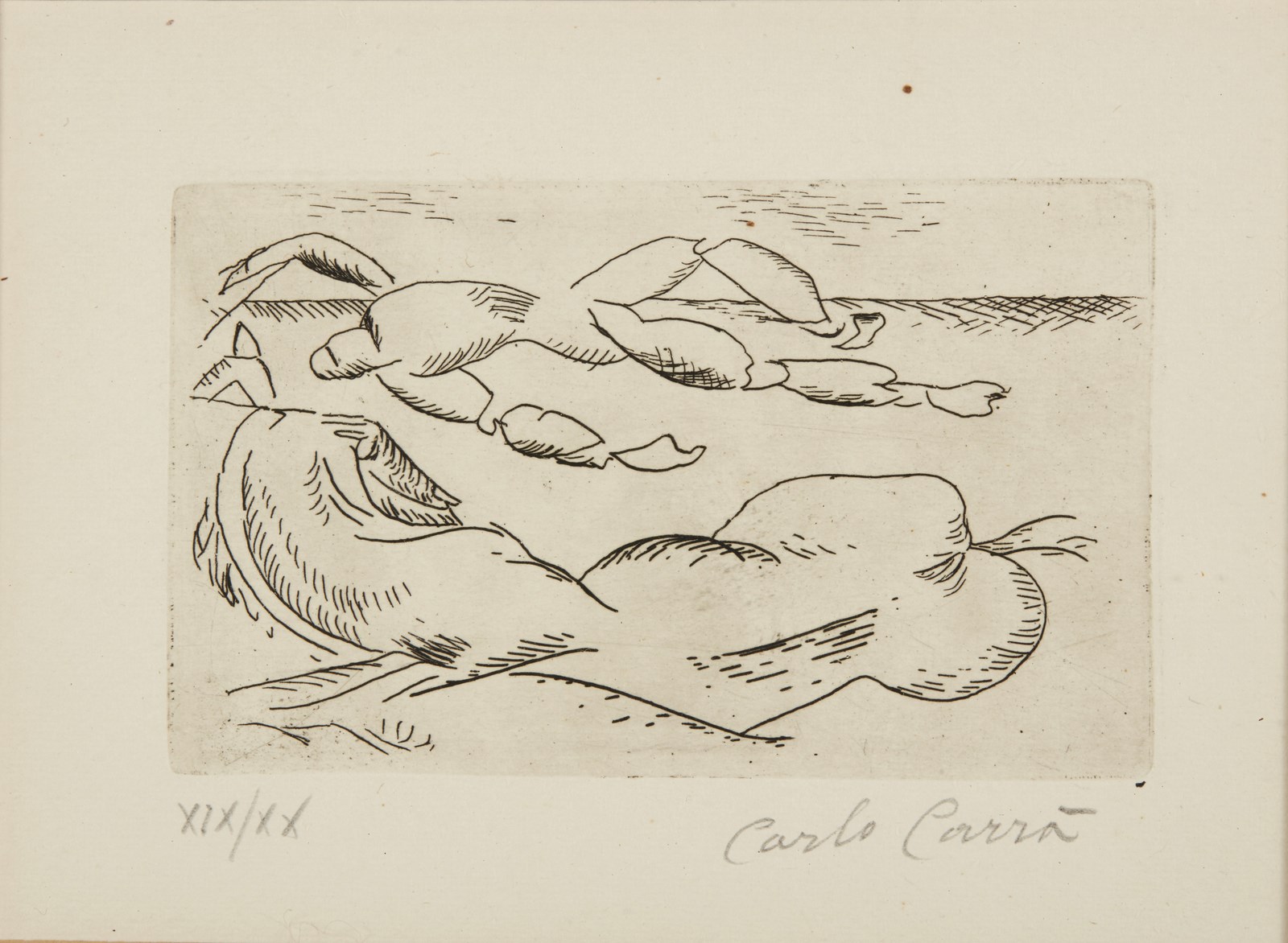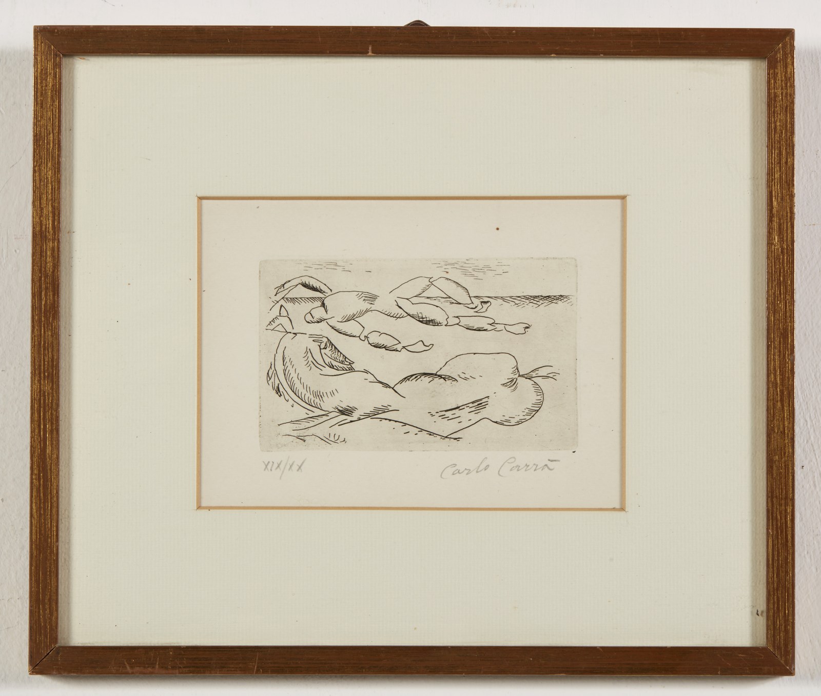 CARRA' CARLO (1881 - 1966) Uomo e cavallo sulla spiaggia ( Cavallo e cavaliere). 1957. Acquaforte. Cm 17,00 x 12,50. XIX/XX. Tiratura e firma a matita in basso. Dimensione lastra: 7.4x10.6 cm. Pubblicazione: M. Carrà 1976, n.44; Massari 1978, n.21; I miei ricordi - Carrà, L'opera grafica 1922 - 1964, a cura di Elena Pontiggia, Medusa Edizioni, pag. 41 tav.30. Edizione Augurio Artistico Prandi , 1957. Cornice presente
