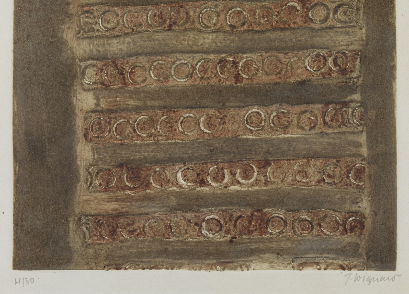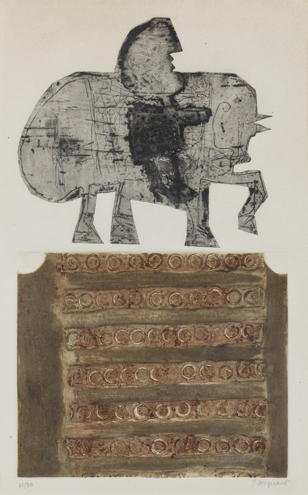 COIGNARD JAMES (1925 - 2008) Senza titolo. Incisione su rame. Cm 35,00 x 55,00. 4/30. Tiratura e firma in basso a matita. Al retro cartiglio descrittivo centro d'arte Settimiano, Roma. Cornice presente
