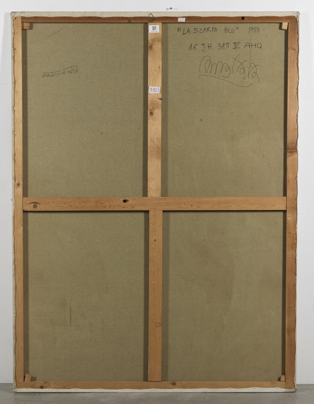 JANUSZ HAKA (n. 1951) La scarpa blu. 1984. Olio su tela . Cm 150,00 x 200,00. Al retro titolo, firma e anno. Provenienza: Collezione Franchini, Genova; Collezione privata, Genova. Lievi difetti.