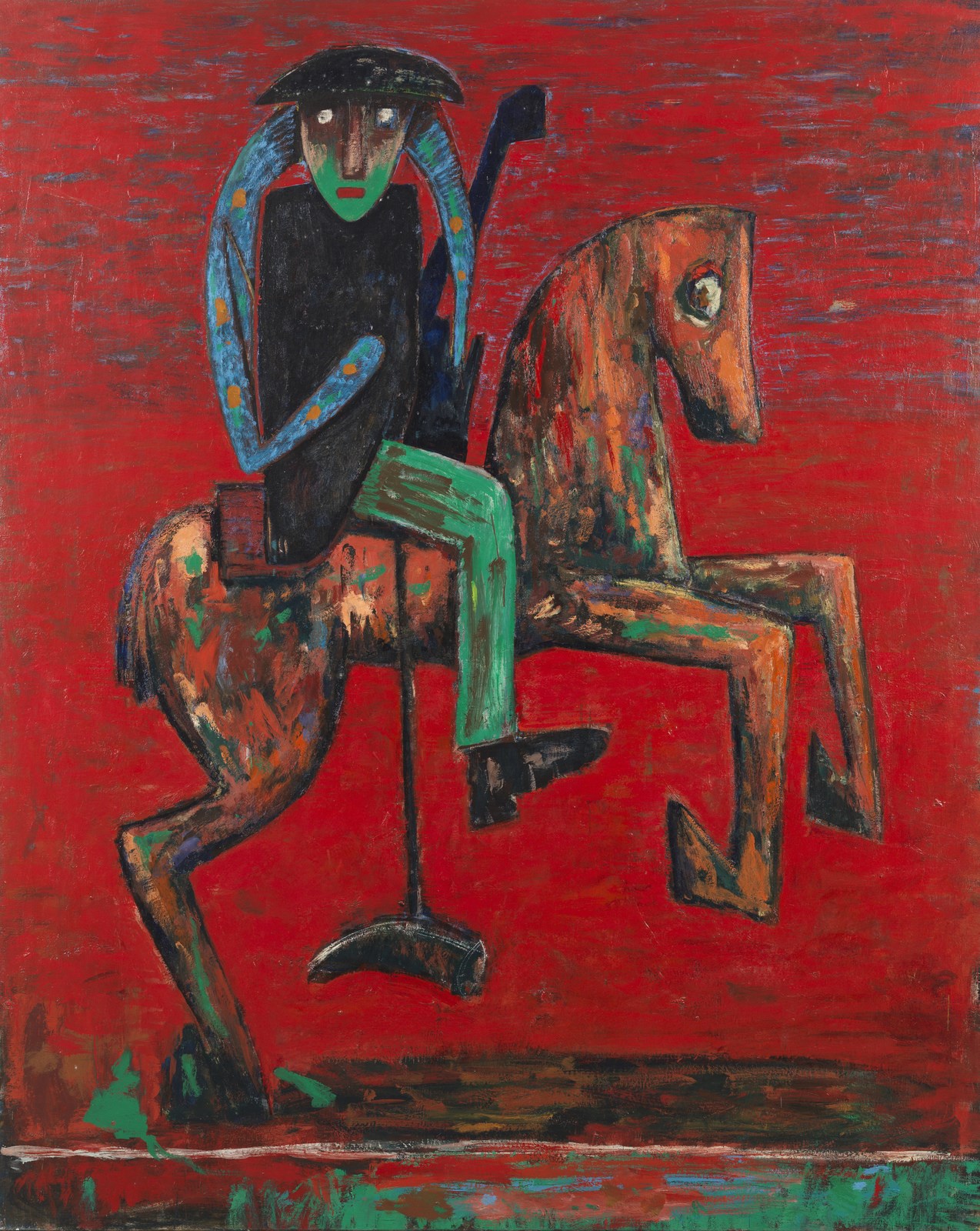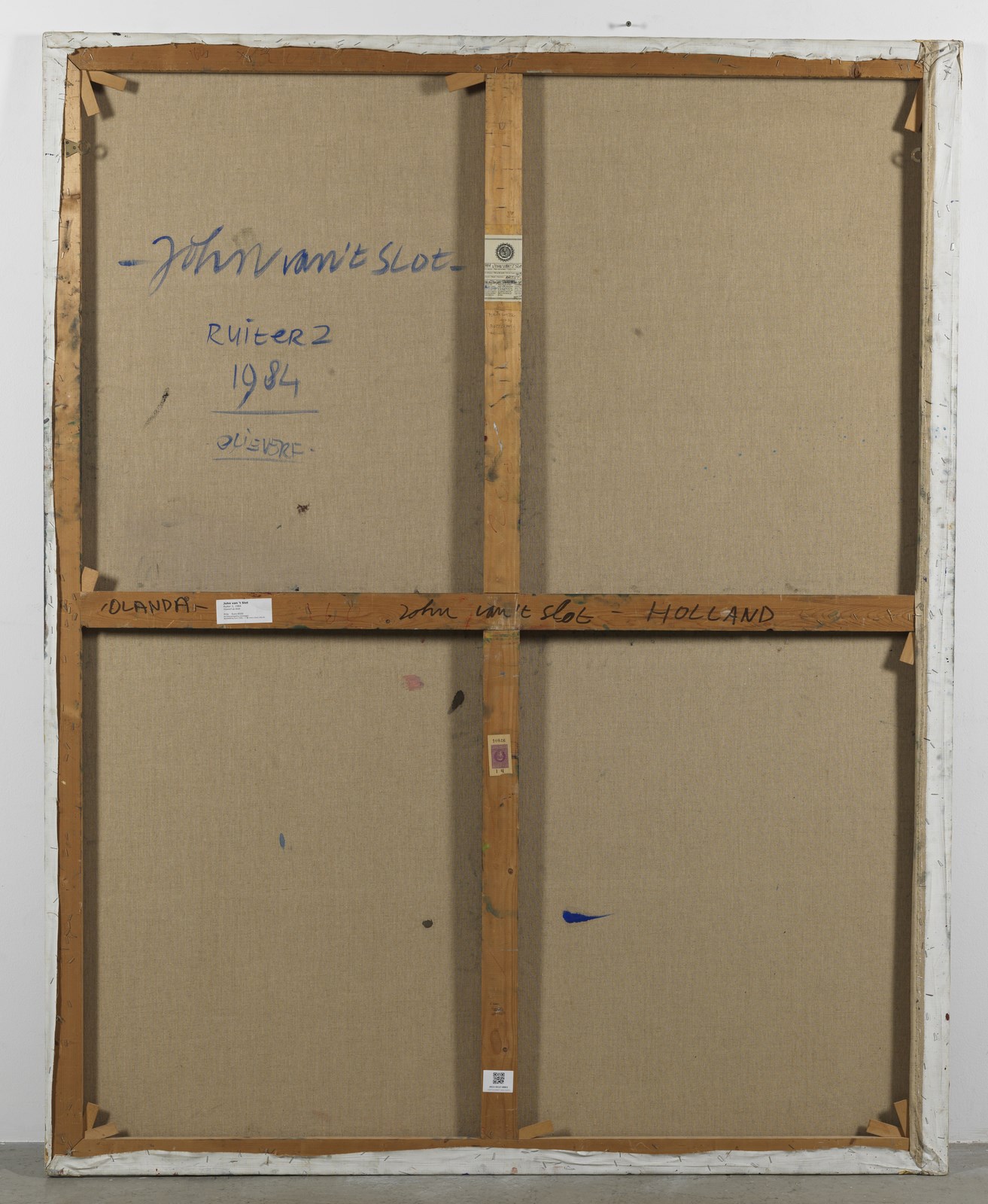 VAN'T SLOT JOHN (n. 1949) Ruiter 2. 1984. Olio su tela . Cm 160,00 x 200,00. Al retro titolo, firma, anno e cartiglio descrittivo. Provenienza: Collezione Franchini, Genova; Collezione privata, Genova. Difetti.