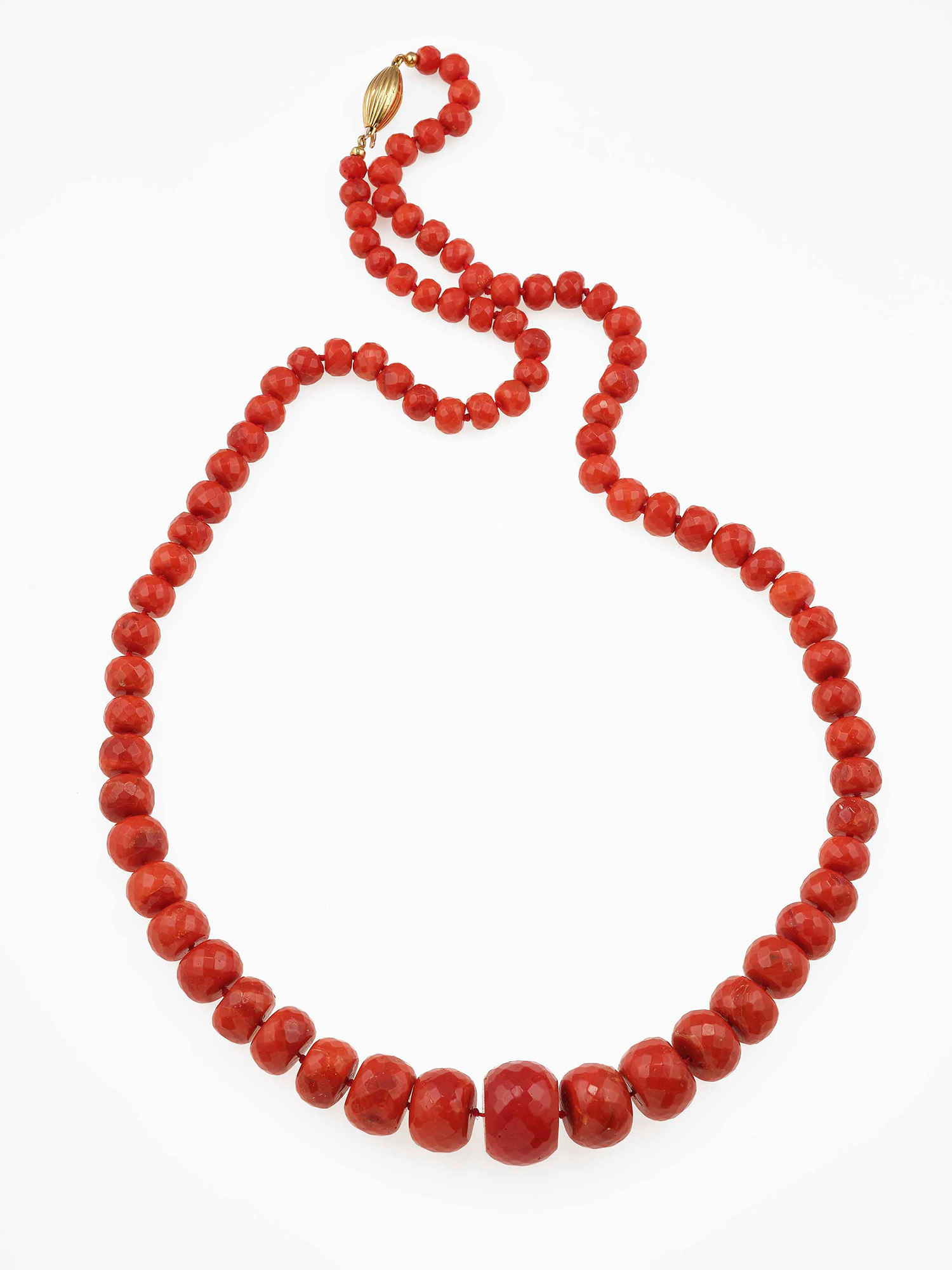 Collana lunga con corallo, fermezza in oro giallo 750/1000, gr. 165,0