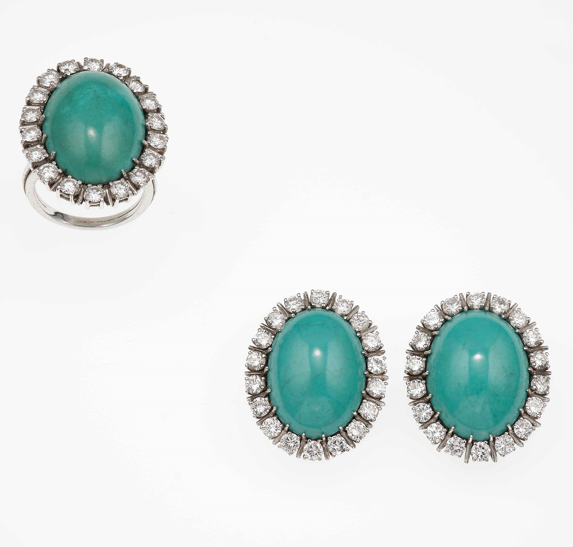 Demi-parure composta da anello ed orecchini con turchesi e diamanti