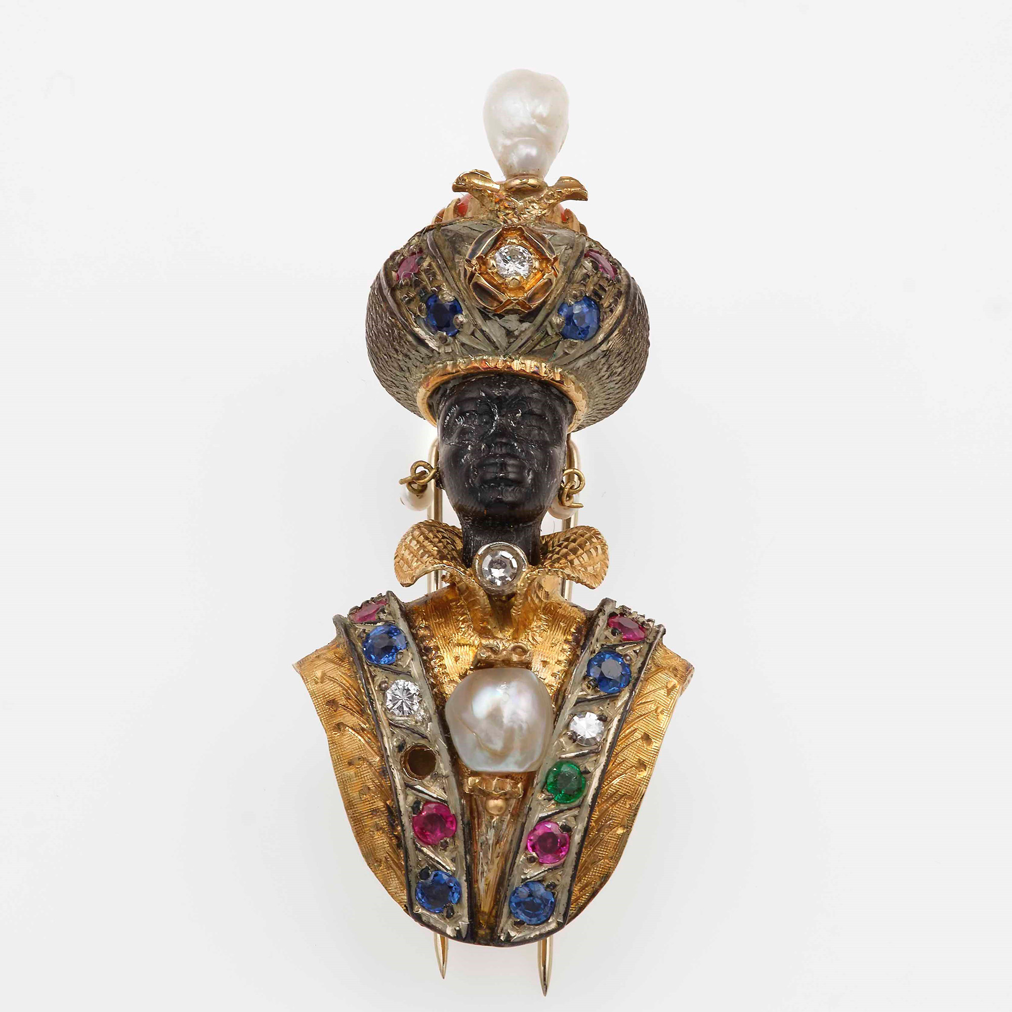 "Moretto", spilla con gem-set, corallo, perle ed ebano