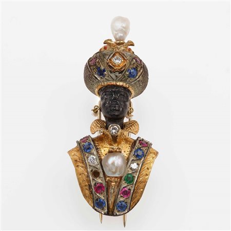 "Moretto", spilla con gem-set, corallo, perle ed ebano, montatura in oro giallo 750/1000 ed argento, gr. 20,0, cm 5.5