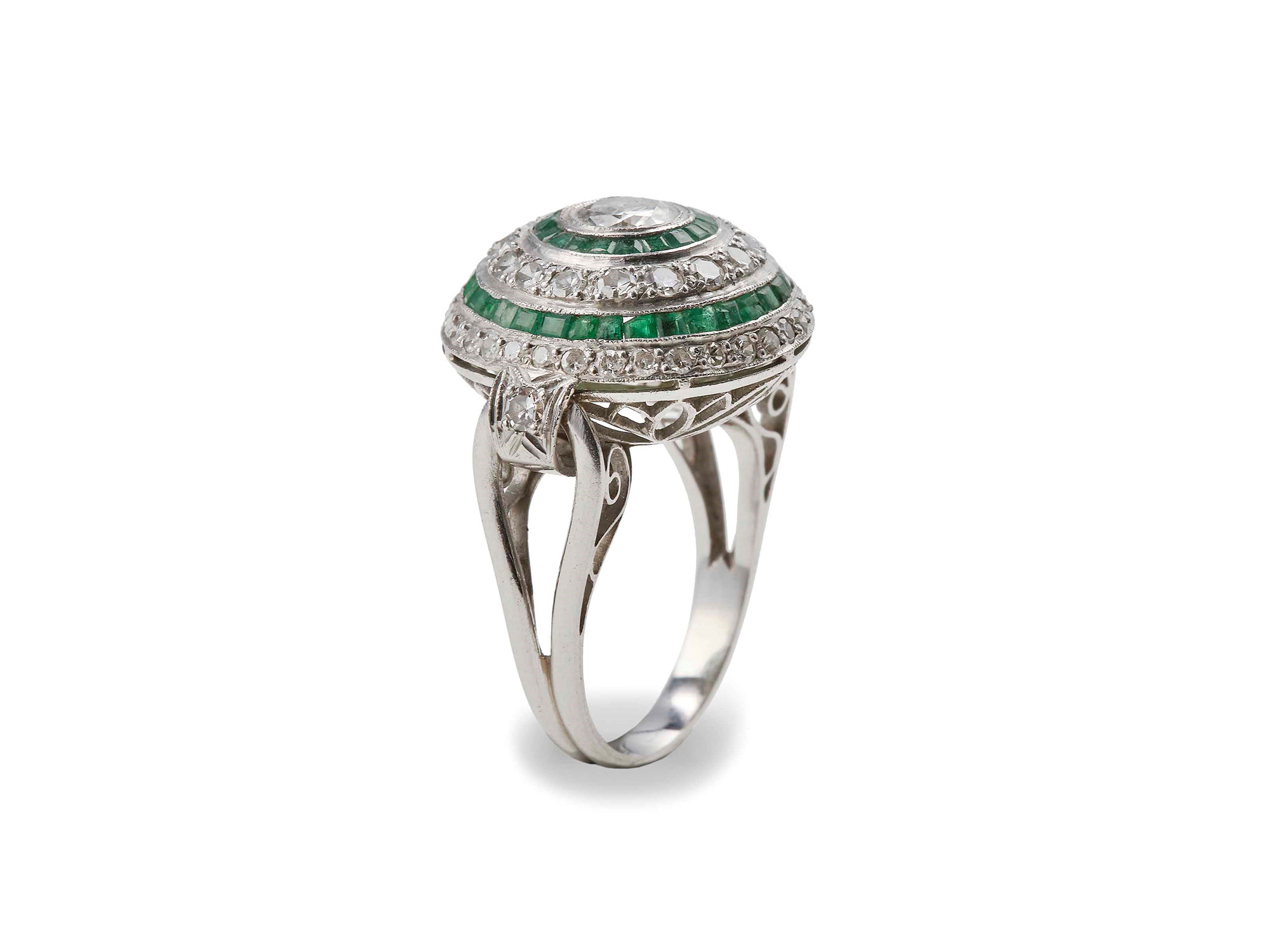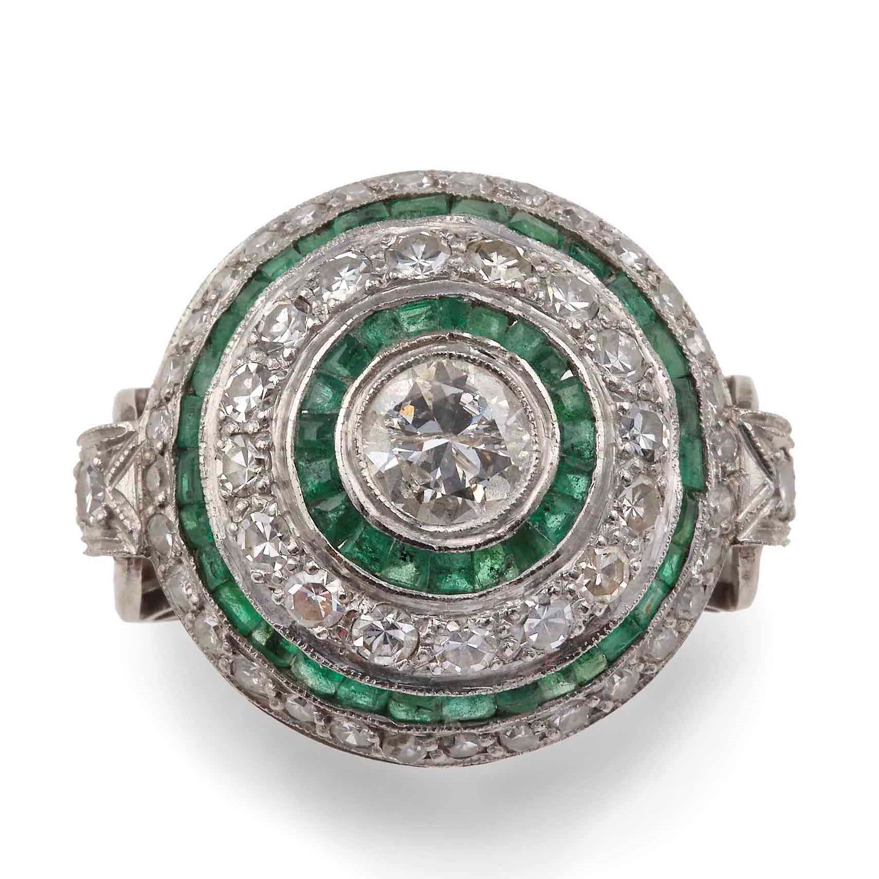 Anello con diamante centrale e smeraldi e diamanti taglio huit-huit a contorno, montatura in platino, gr 9.7, misura italiana 17