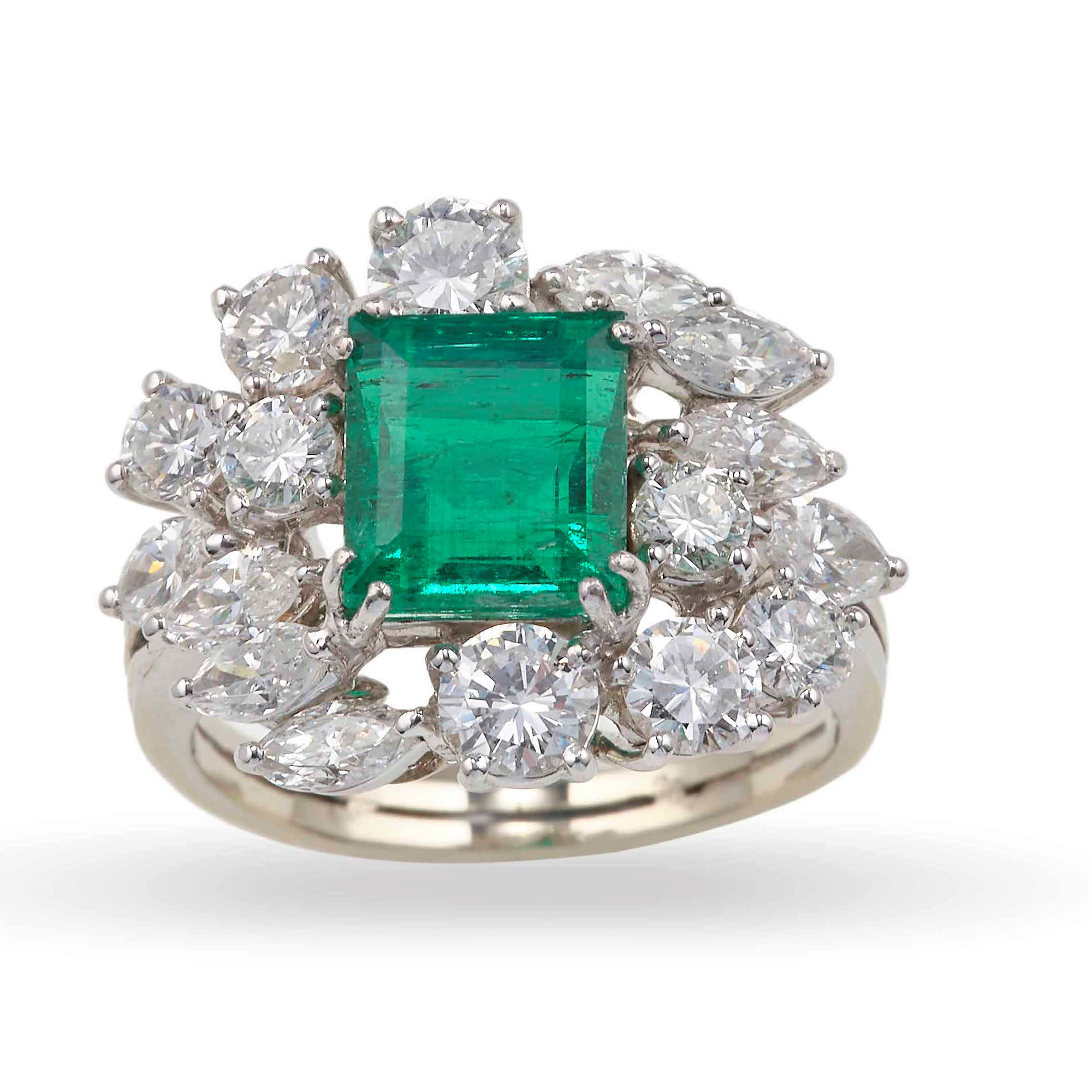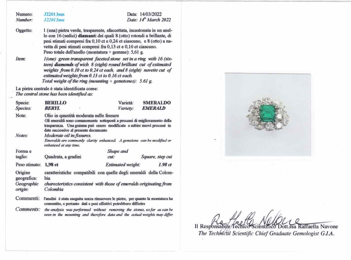 Anello con smeraldo Colombia di ct 1.98 stimati e diamanti, montatura in oro bianco 750/1000., Gemological Report R.A.G. Torino n. J22013mn, misura italiana 9.5, gr. 5,6