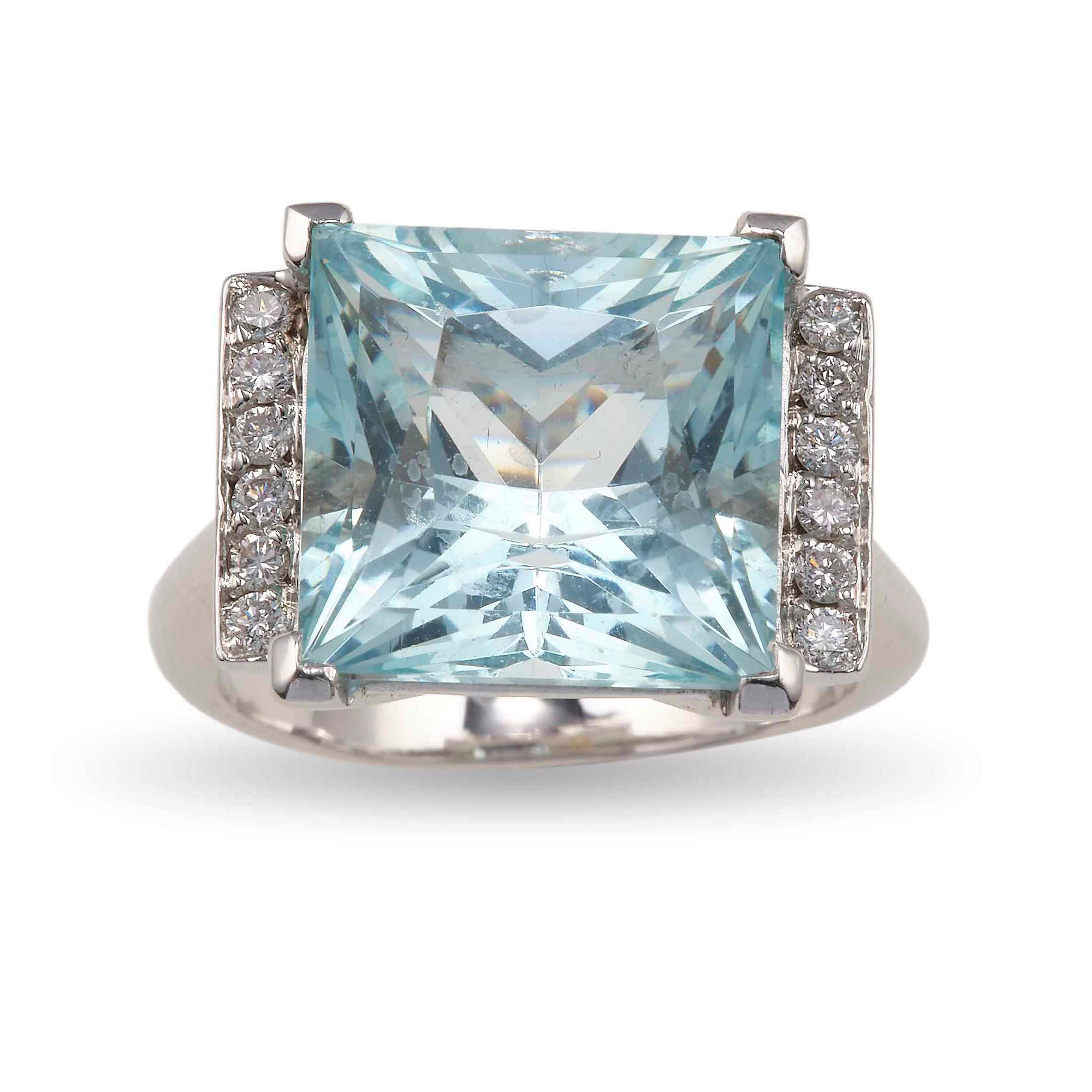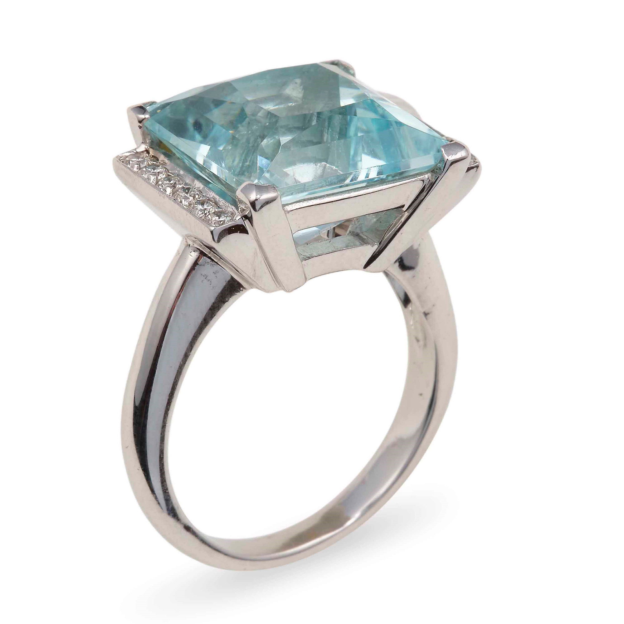 Anello con acquamarina di ct 13.00 circa e diamanti, montatura in oro bianco 750/1000, misura italiana 20.5, gr. 14,8