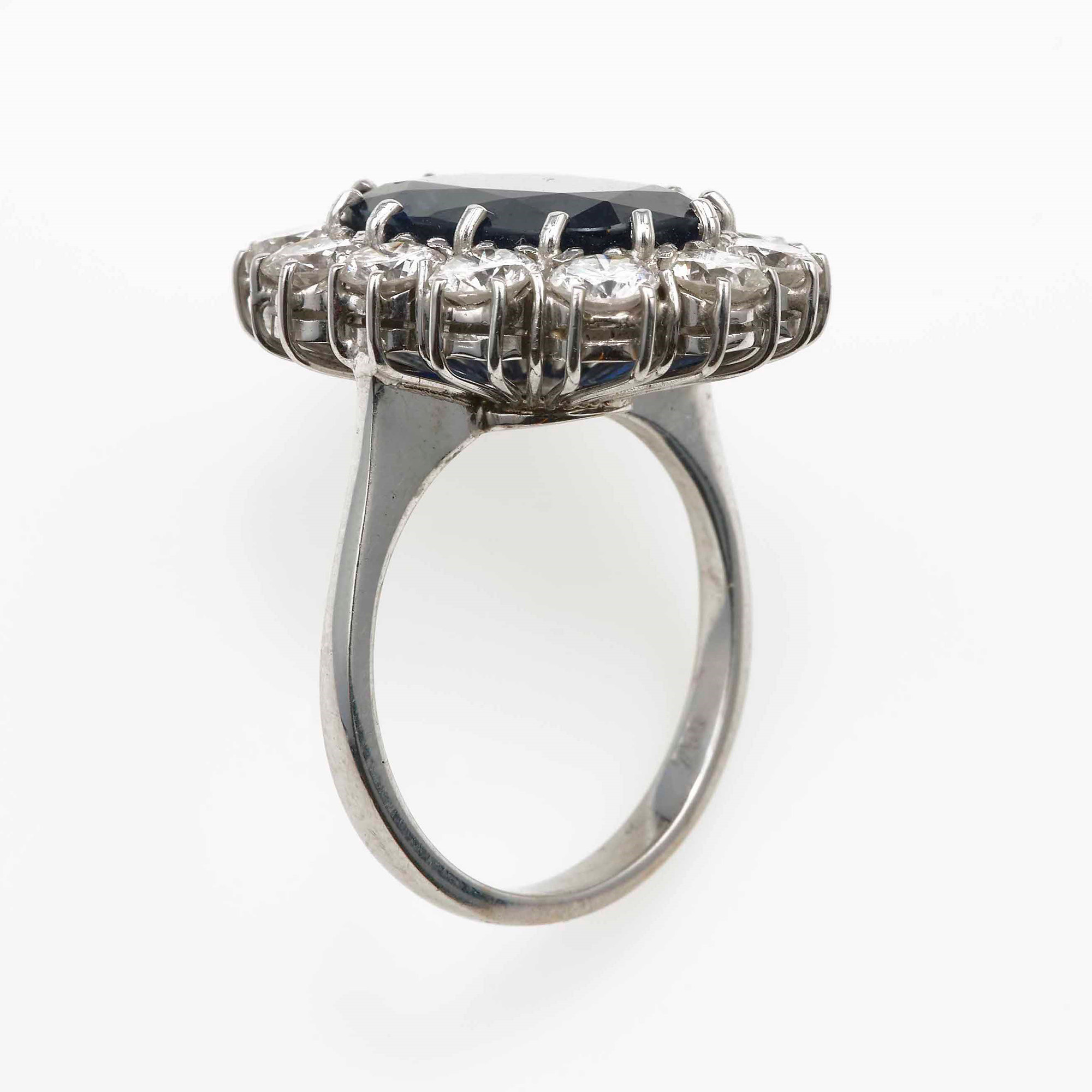 Anello con zaffiro Australia di ct 8.50 circa e diamanti taglio brillante per ct 2.40 circa, a contorno, montatura in oro bianco 750/1000, gr 9.4, misura italiana 17