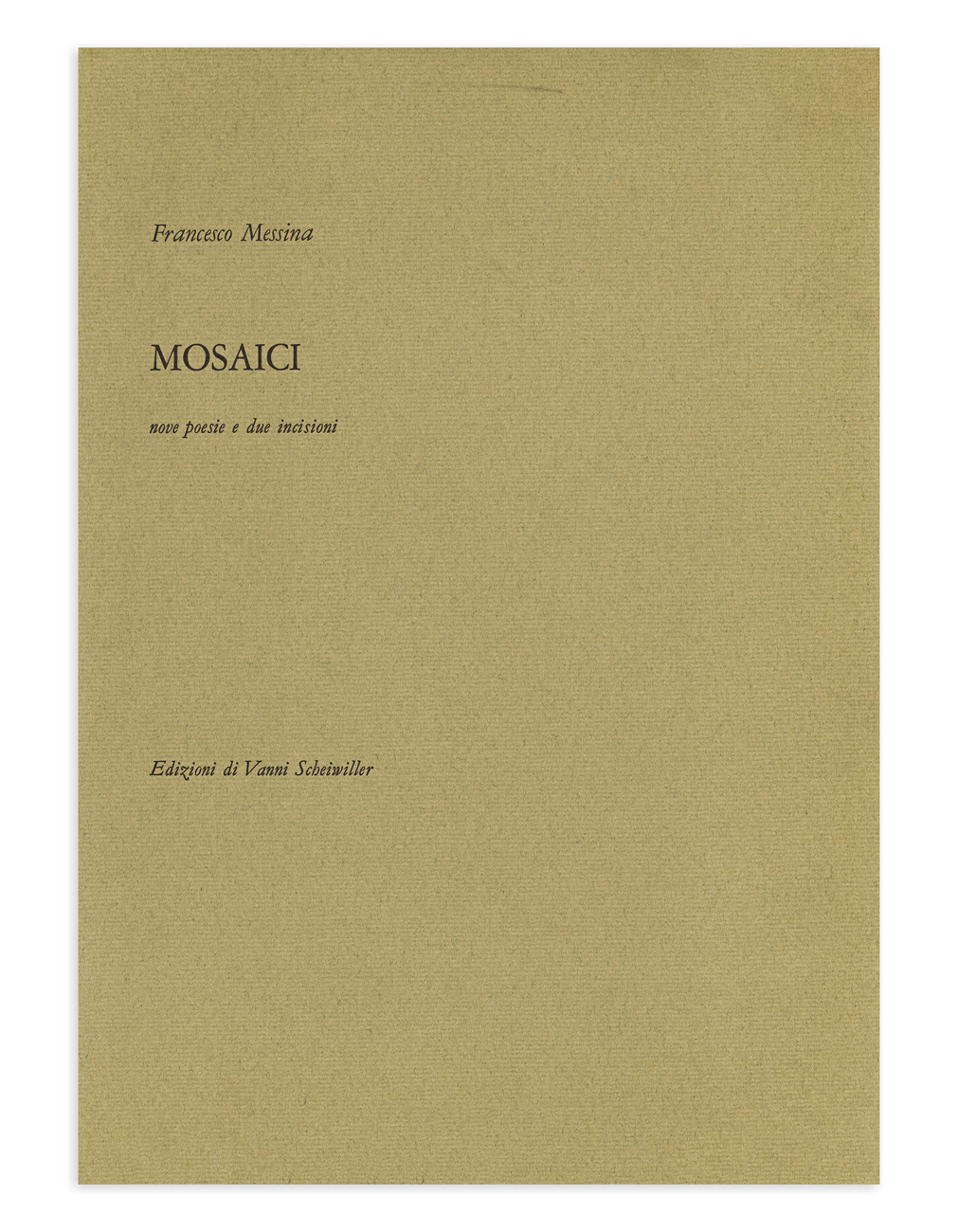 Cartella contenente 9 poesie e 2 incisioni di Francesco Messina, ciascuna recante firma e numerazione (Esemplari P.d.a.) a matita al fronte
