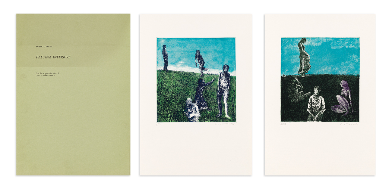 Cartella contenente testi di Roberto Sanesi e 2 acqueforti di Giuliano Collina, ciascuna recante firma, datazione e numerazione (Esemplari 8/50) a matita al fronte