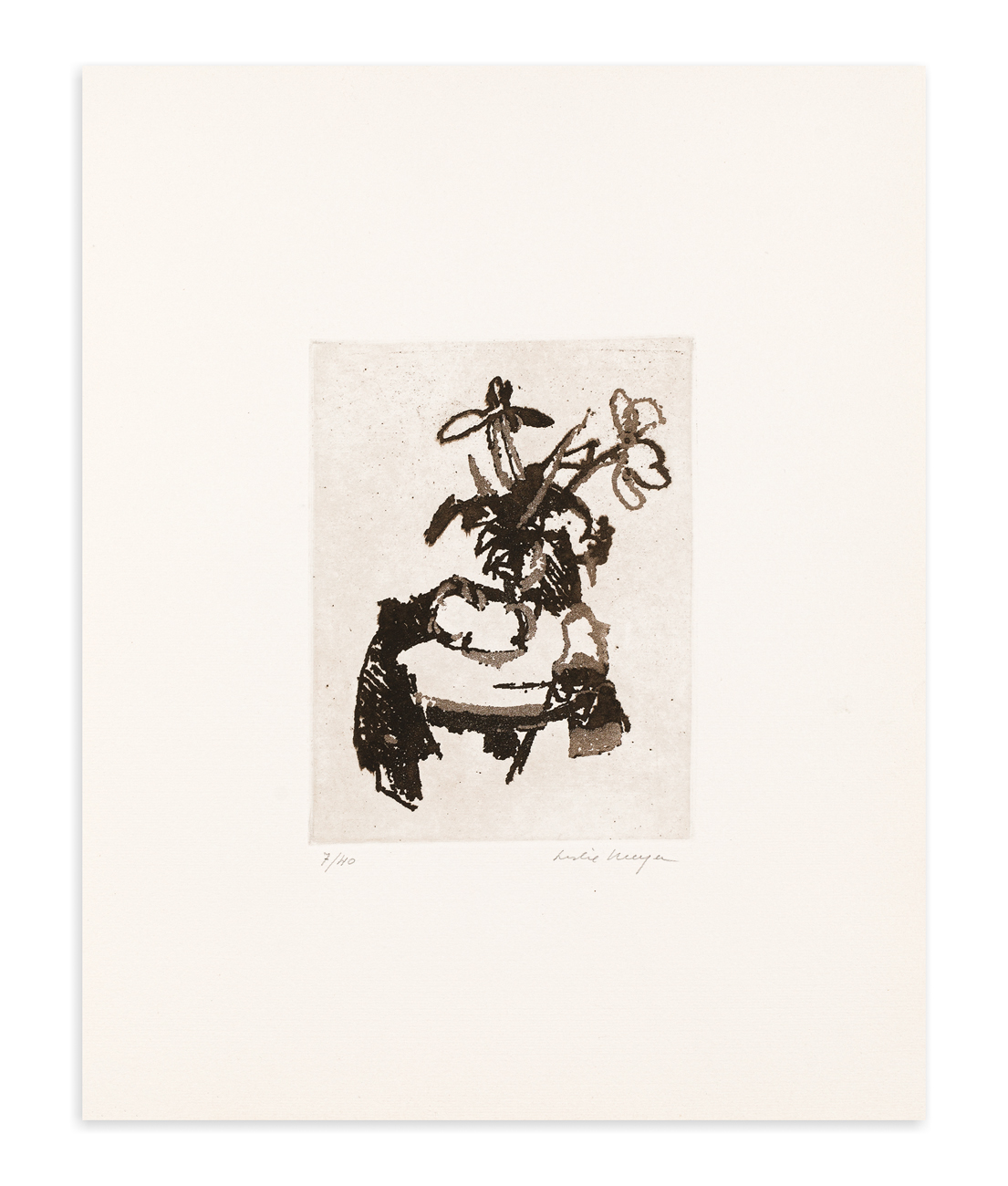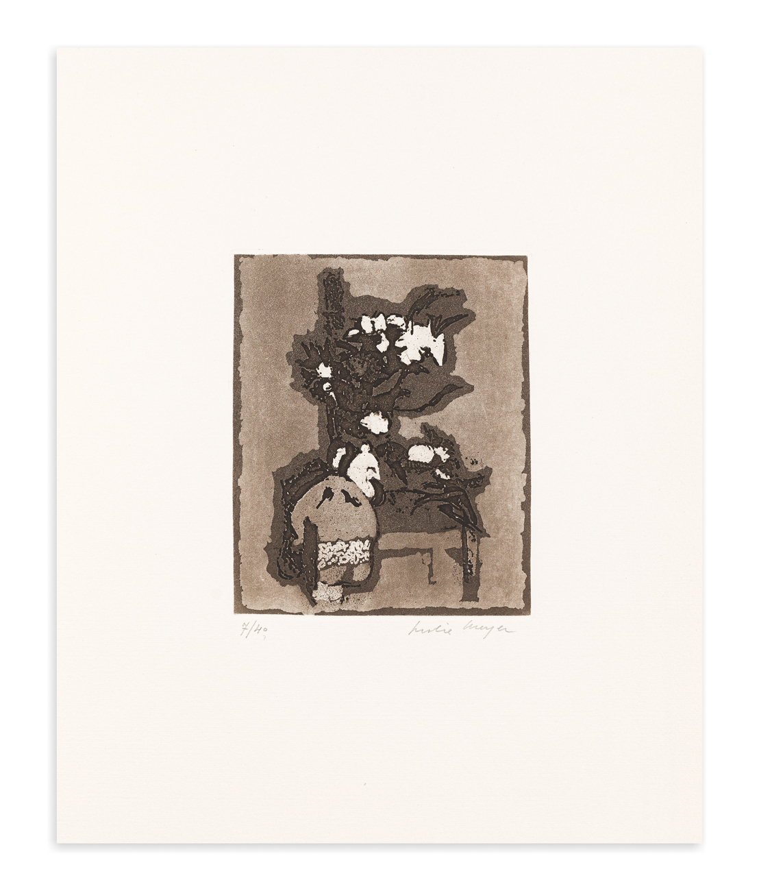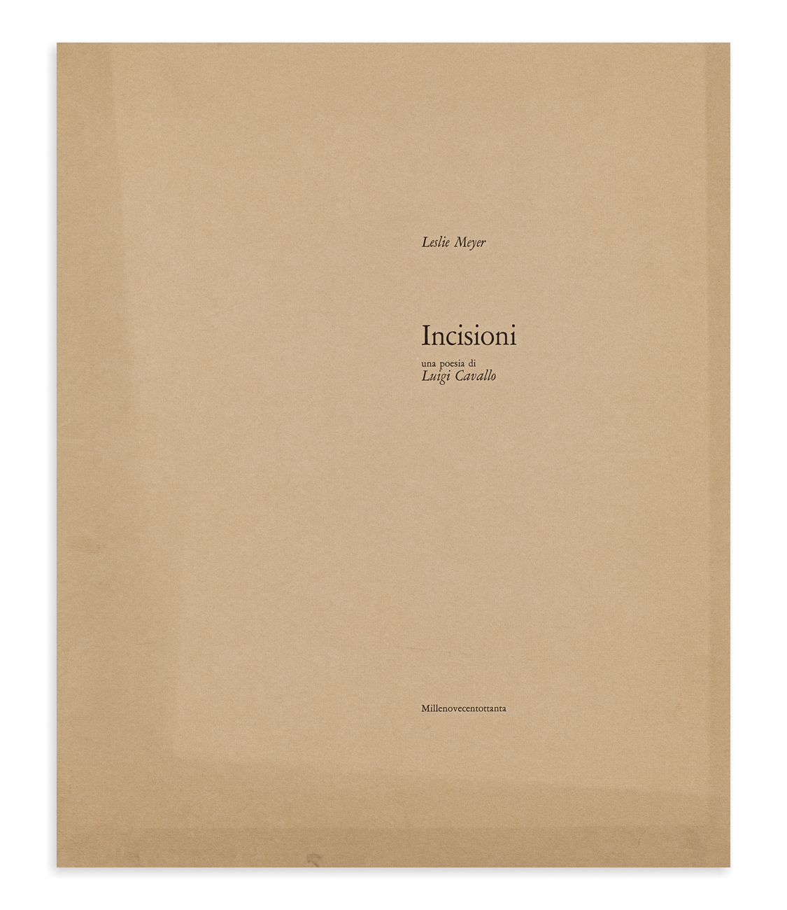 Cartella con poesia di Luigi Cavallo e 6 incisioni di Leslie Meyer, ciascuna recante firma e numerazione (Esemplari 7/40) a matita al fronte
