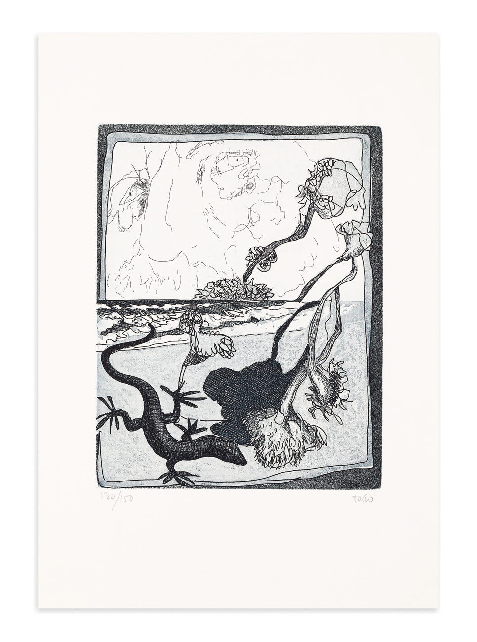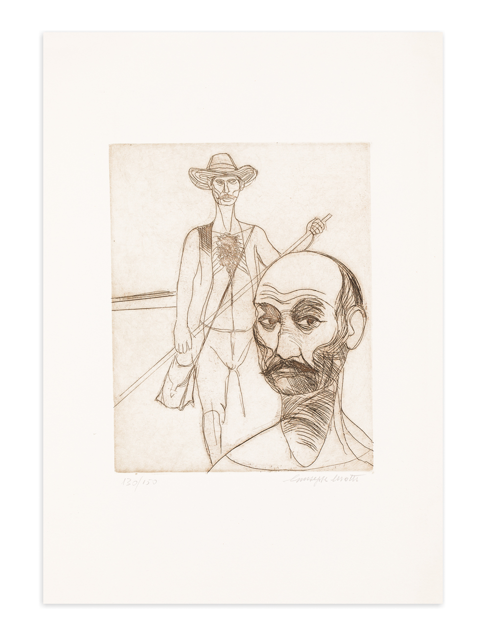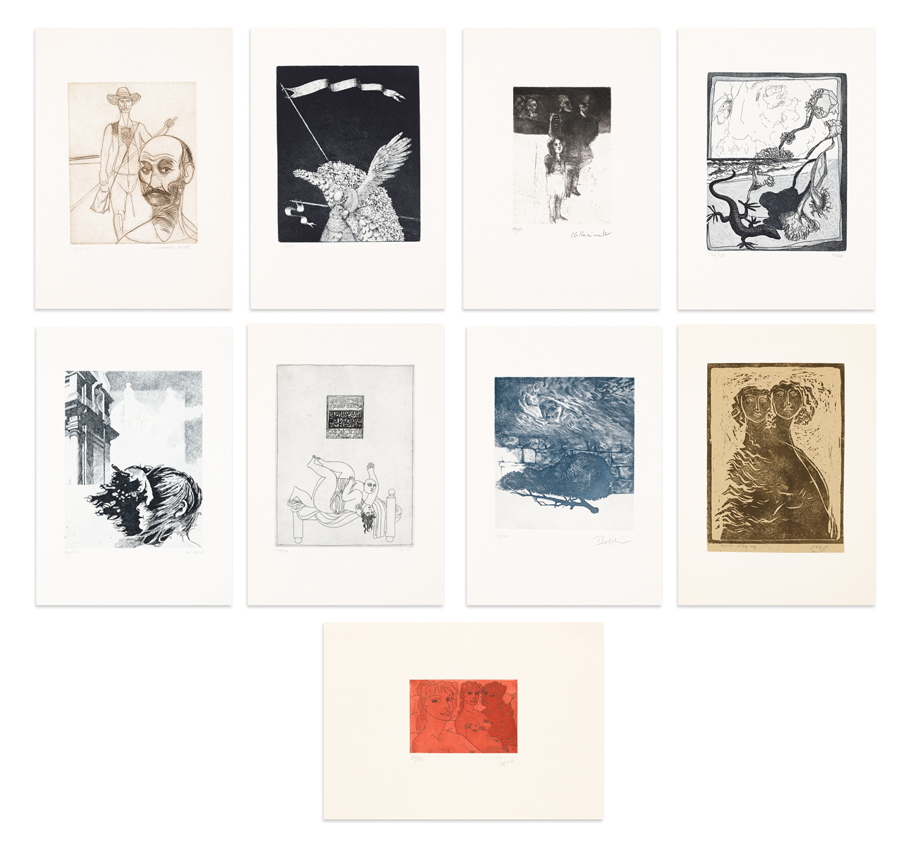 Cartella contenente 9 acqueforti di Giuseppe Motti, Benito Trolese, Alessandro Kokocinski, Togo, Mario Bardi, Tono Zancanaro, Faisel El Sahi e 2 autori indecifrati (sulla cartella appuntati come M. Mussner e Baldin), ciascuna recante firma e numerazione (Esemplari 130/150) a matita al fronte