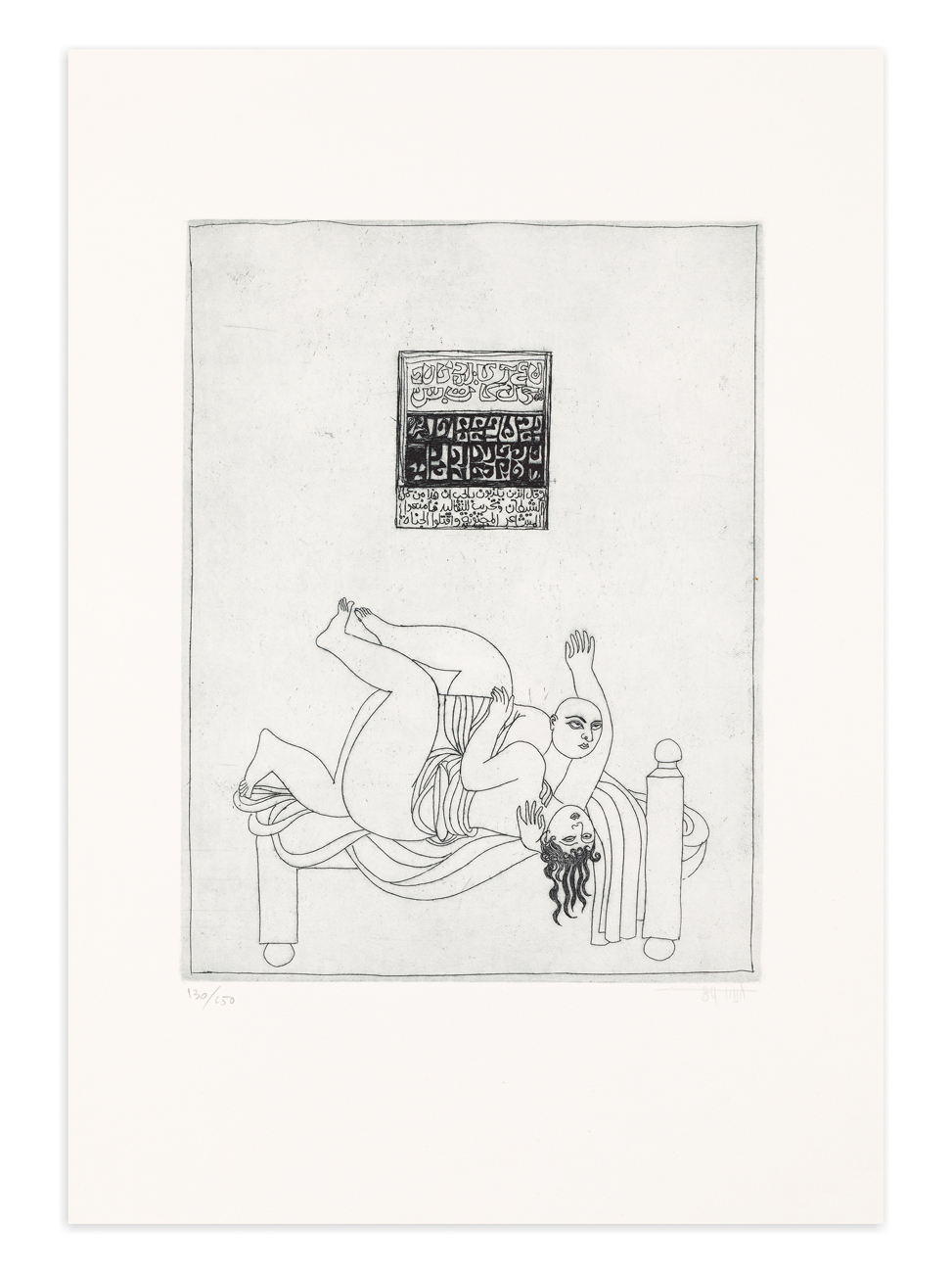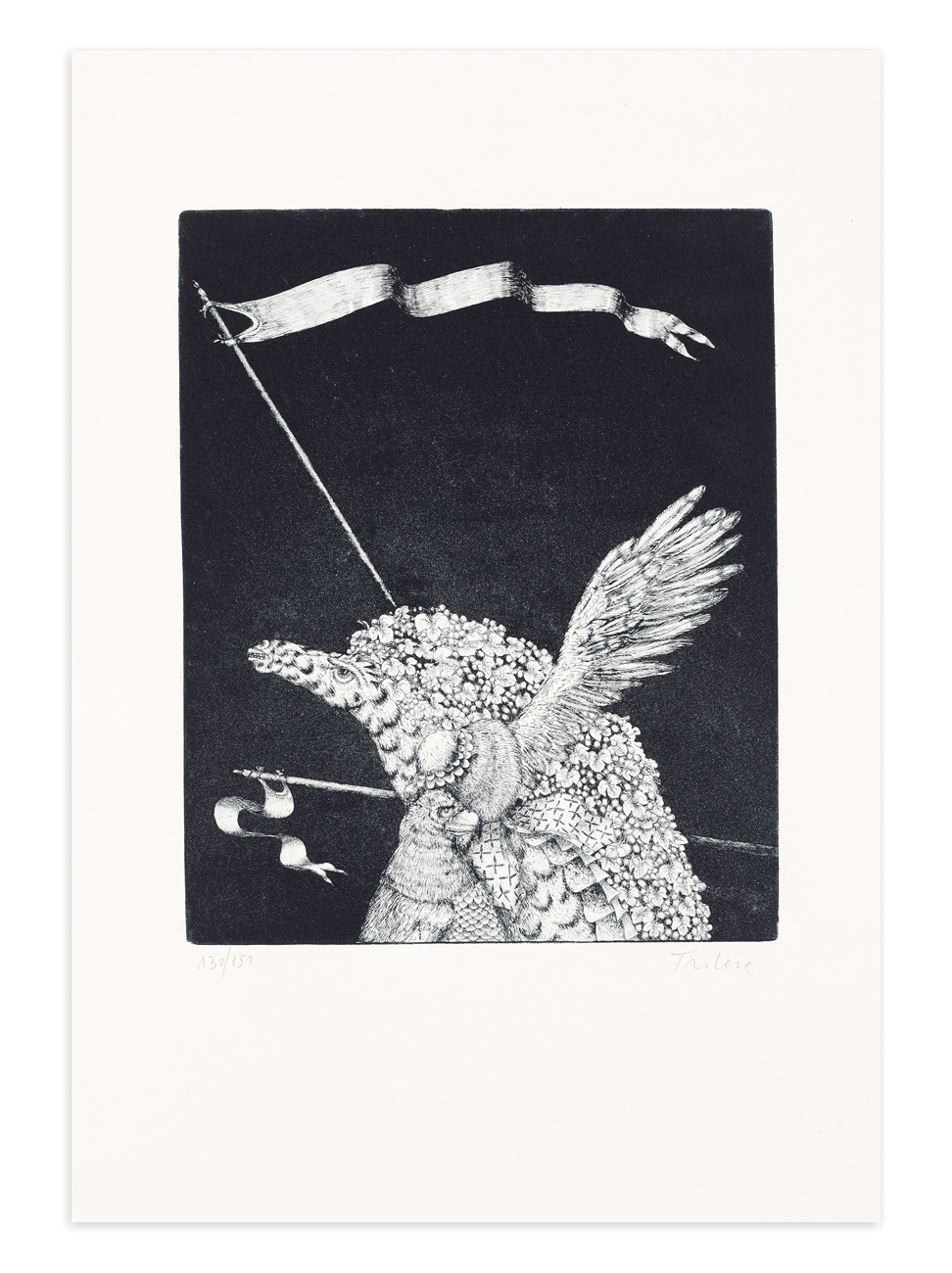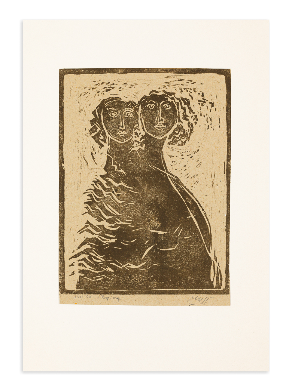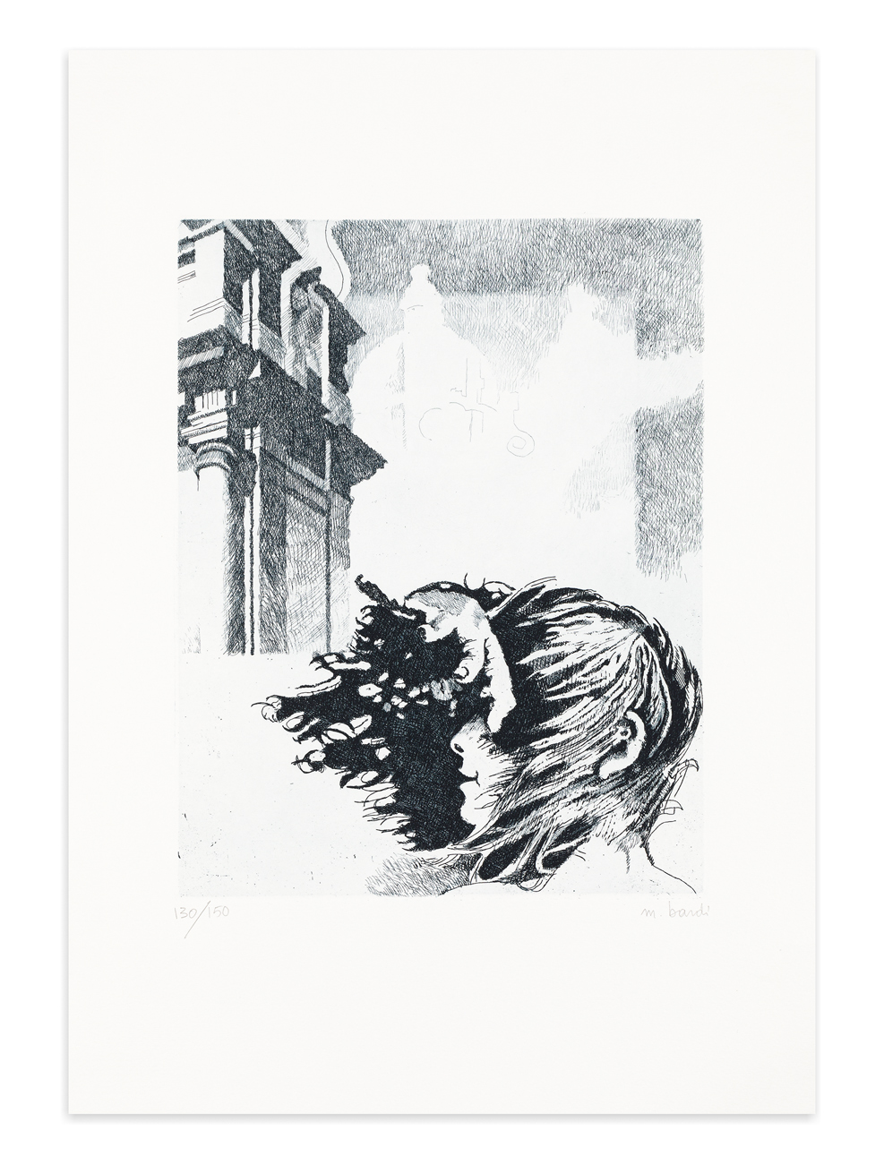Cartella contenente 9 acqueforti di Giuseppe Motti, Benito Trolese, Alessandro Kokocinski, Togo, Mario Bardi, Tono Zancanaro, Faisel El Sahi e 2 autori indecifrati (sulla cartella appuntati come M. Mussner e Baldin), ciascuna recante firma e numerazione (Esemplari 130/150) a matita al fronte