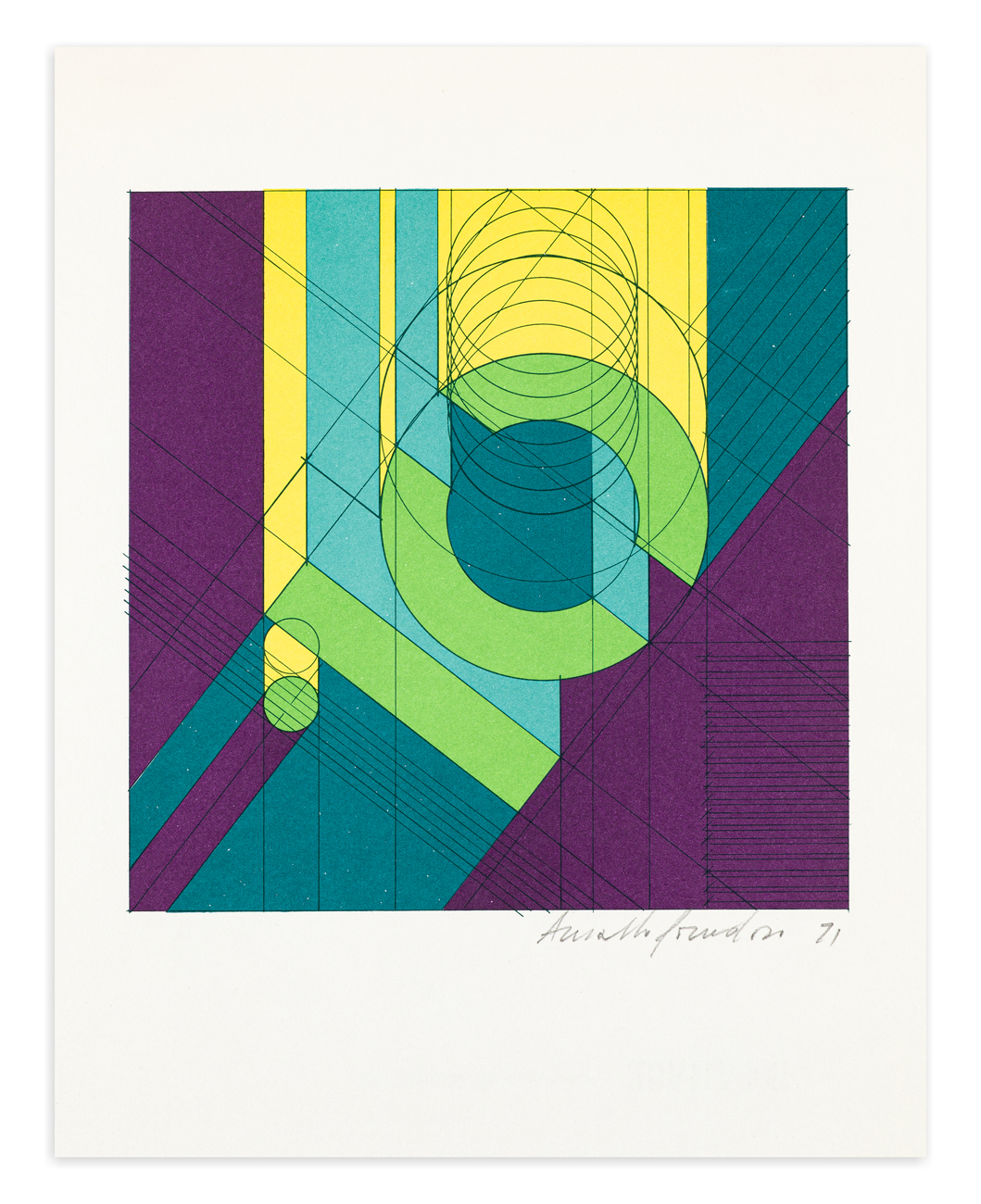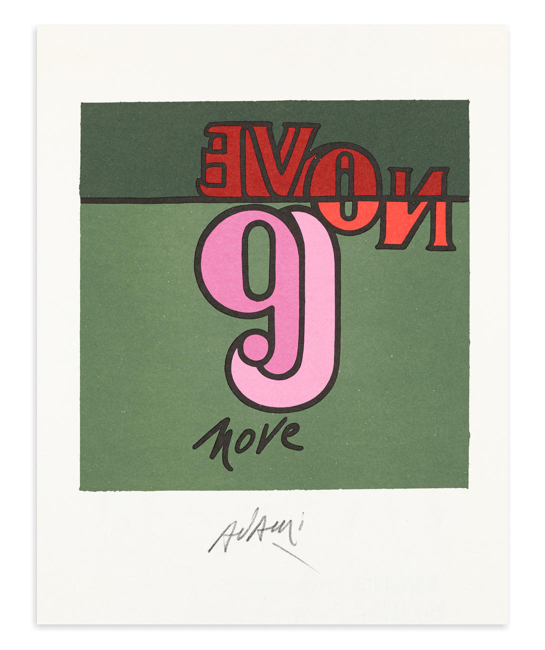 Si allega una ulteriore riproduzione fotolitografica (4 colori offset) di Sergio Saroni, recante firma a matita al fronte, espressamente eseguita per gli auguri di Bolaffiarte del 1971 (Esemplare 1521 di una tiratura di 5000 esemplari), come da indicazioni al retro