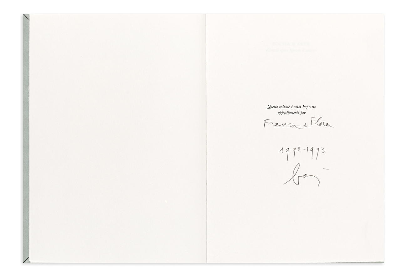 Cofanetto contenente un fascicolo illustrato con 3 tavole a colori di Enrico Baj e una cartella contenente le 3 incisioni originali dell'Artista, ciascuna recante firma e numerazione (Esemplari XLIII/CXXX) a matita al fronte