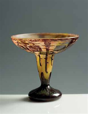 Le Verre Français. Coppa in vetro cammeo con bacche in marrone su fondo nei toni del giallo e arancione, 1925 circa. Firma incisa: Le Verre Français cm 18,5x20