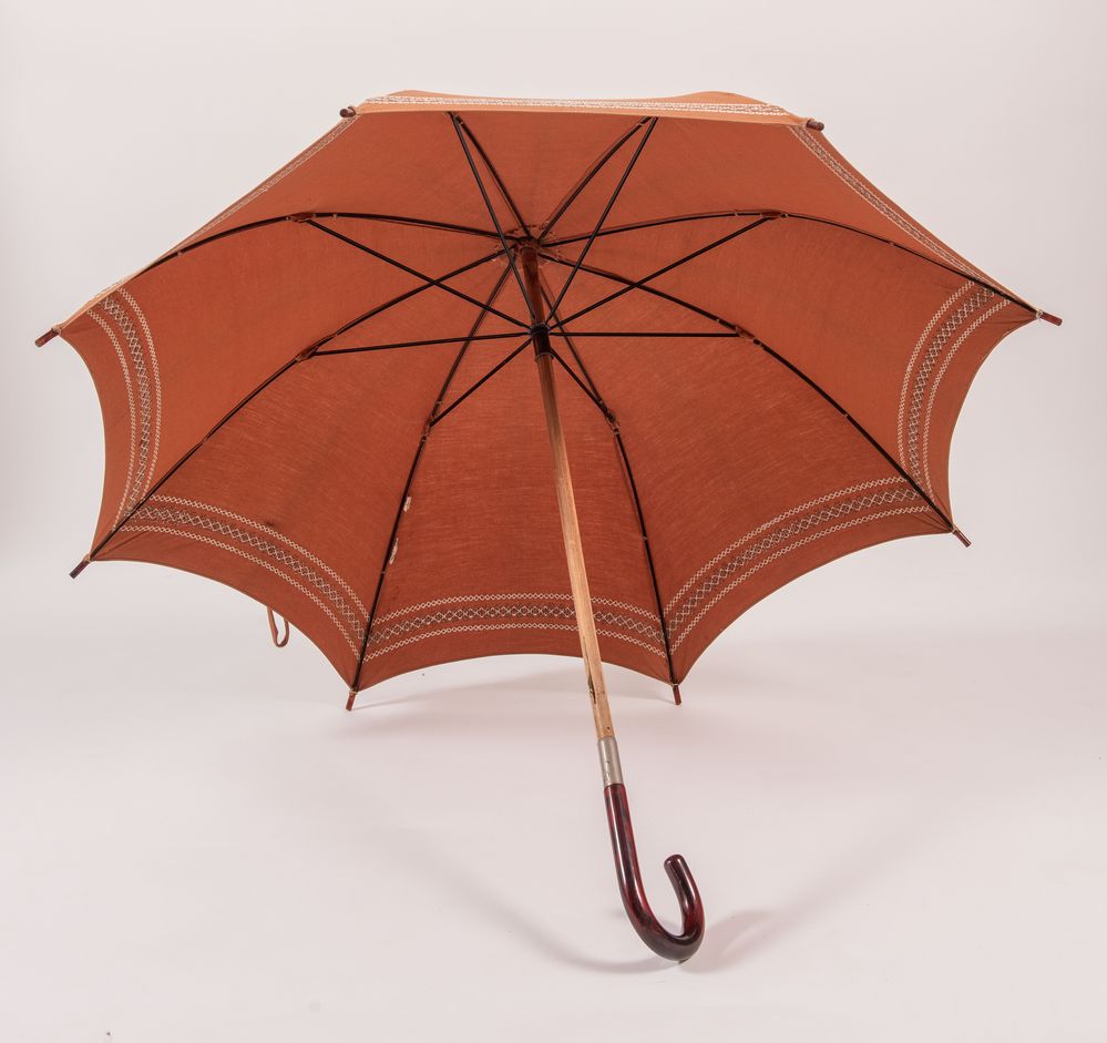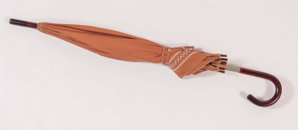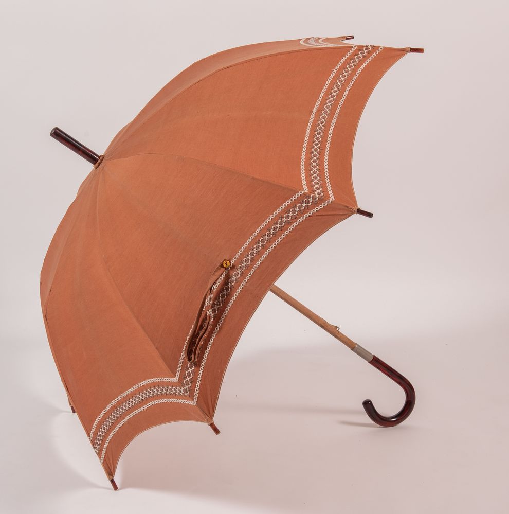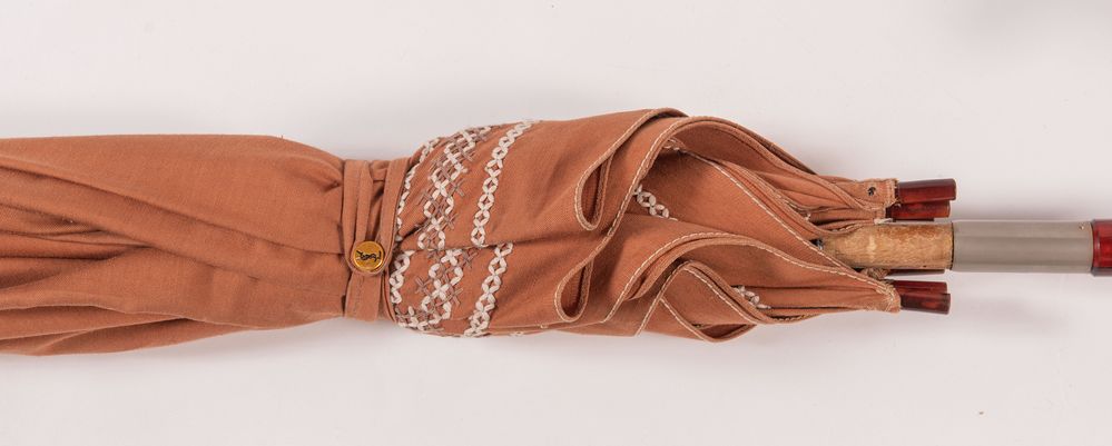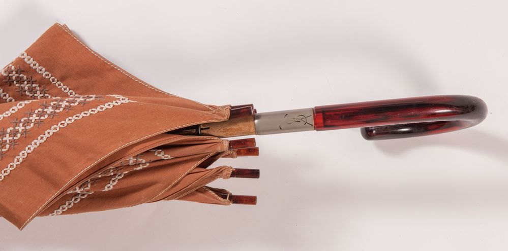 YVES SAINT LAURENT Ombrello in tela di cotone color rosa antico con rifiniture del perimetro ricamate e dettagli del manico e delle punte in resina ambrata trasparente. Anni '70. Composizione: 100% cotone. Reca firma Yves Saint Laurent, marchi YSL ed etichetta Made in Italy. (Difetti)