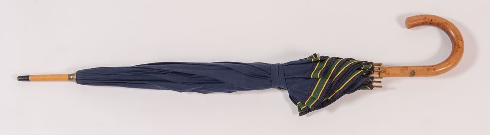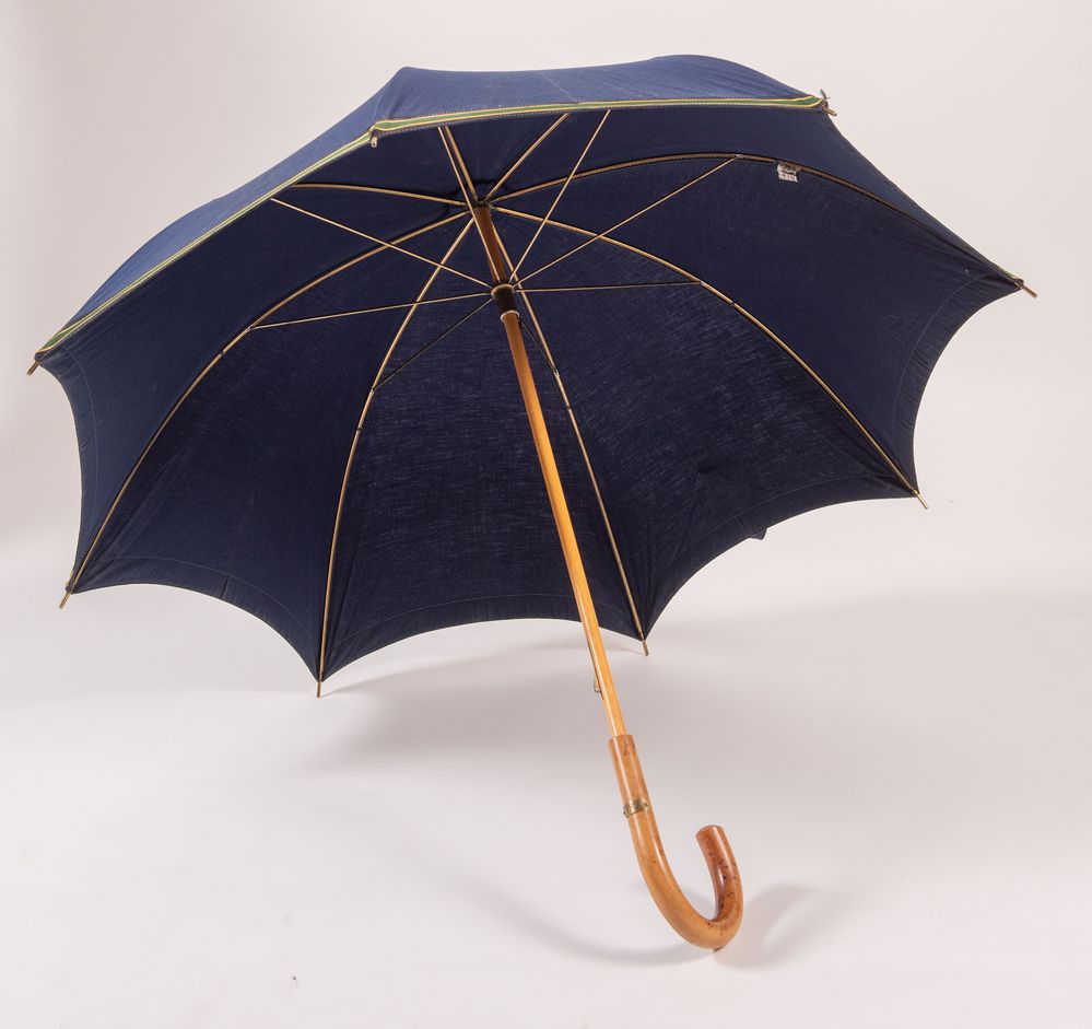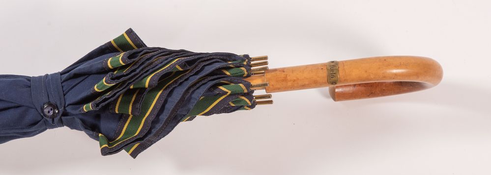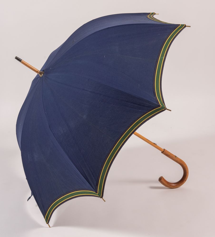 FURLA Ombrello in cotone blu con dettaglio del perimetro a nastro verde e giallo. Anni '70 ca. Altezza: cm 91. Composizione: 100% cotone. Reca targhetta in metallo con marchio Furla. (Difetti)