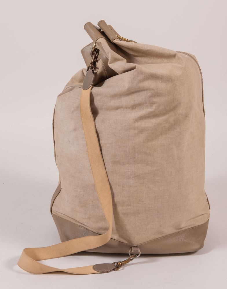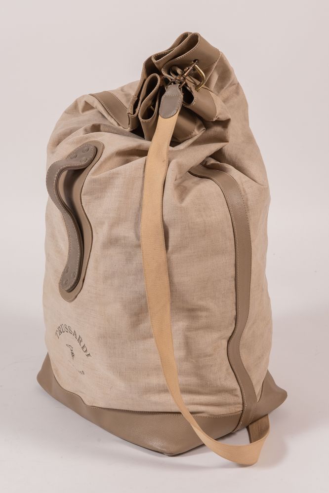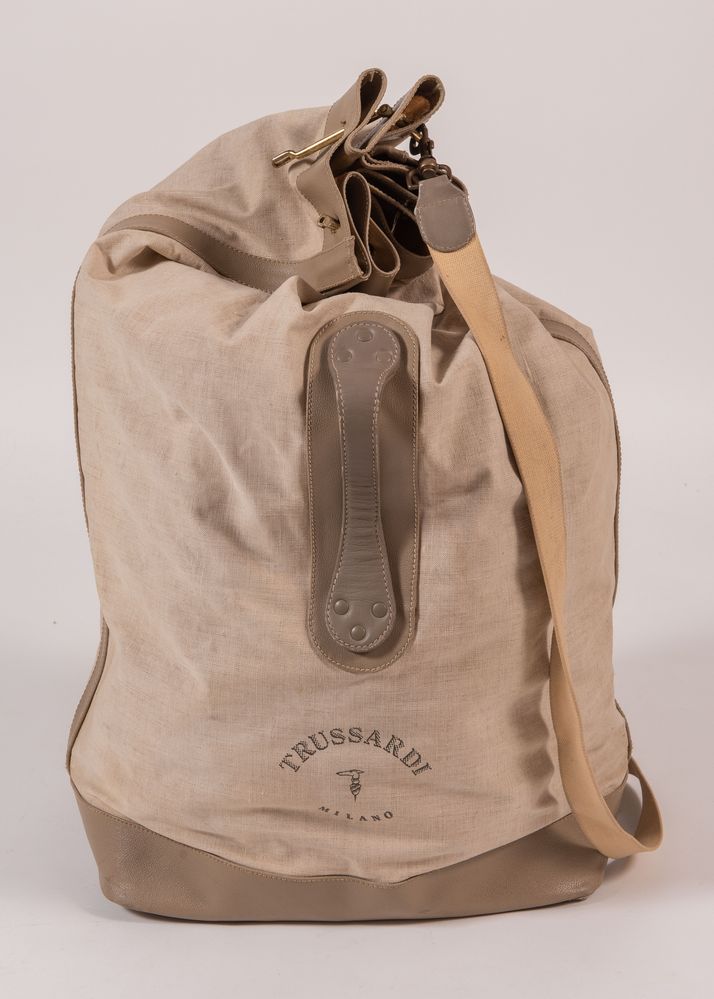 TRUSSARDI Borsone da viaggio con tracolla rimovibile in tela color tortora e rifiniture in pelle. Cm 77x30. Lunghezza totale tracolla: cm 118. Reca marchio Trussardi Milano. (Difetti)