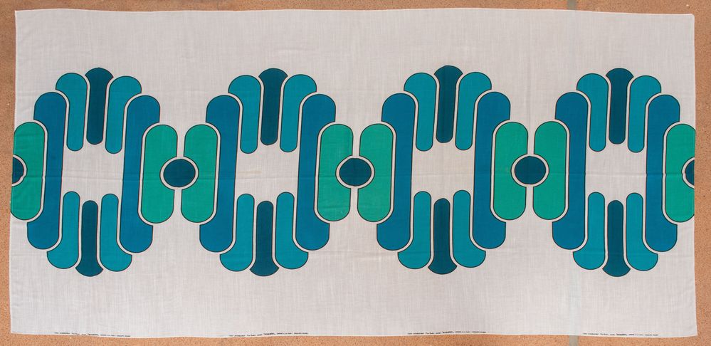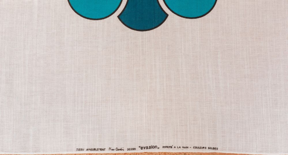 PIERRE CARDIN Tessuto arredo "Evasion" in tela di cotone stampata a mano sui toni del verde e del blu. Cm 200x360. Reca firma e iscrizione Tissu ameublement Pierre Cardin design "evasion" imprimé a la main - couleurs solides