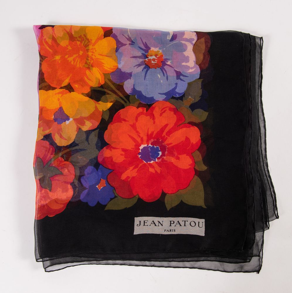 JEAN PATOU Foulard in seta semi trasparente con motivo floreale. Cm124x124....