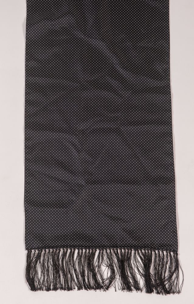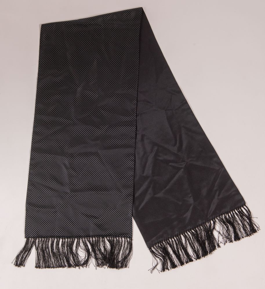 GIORGIO ARMANI Diffusione Stola in misto seta nera con uno dei due lati a pois terminante con frange. Cm 158x31. Reca etichetta Giorgio Armani Diffusione Made in Italy.