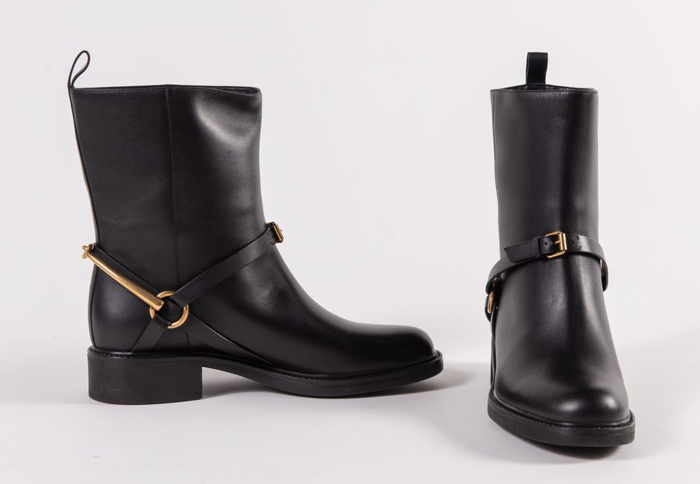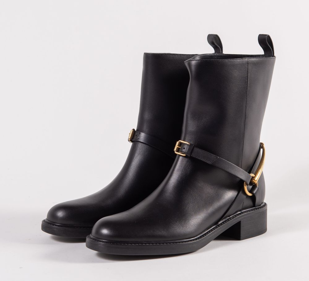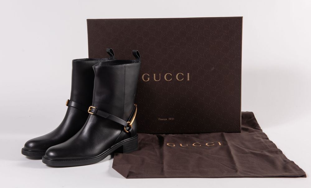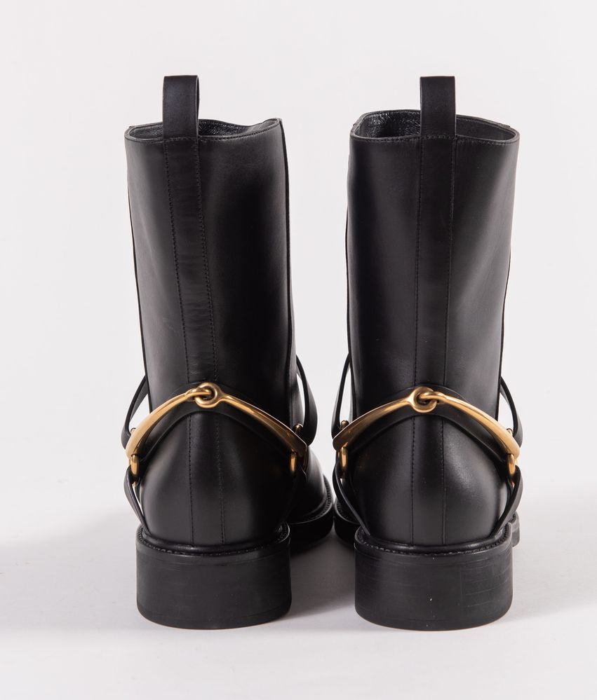 GUCCI Stivaletti in pelle con dettagli a staffe in metallo dorato. Riportano taglia 37,5. Recano marchi Gucci Made in Italy e codice di riferimento prodotto. Corredati di dustbag e scatola originale.