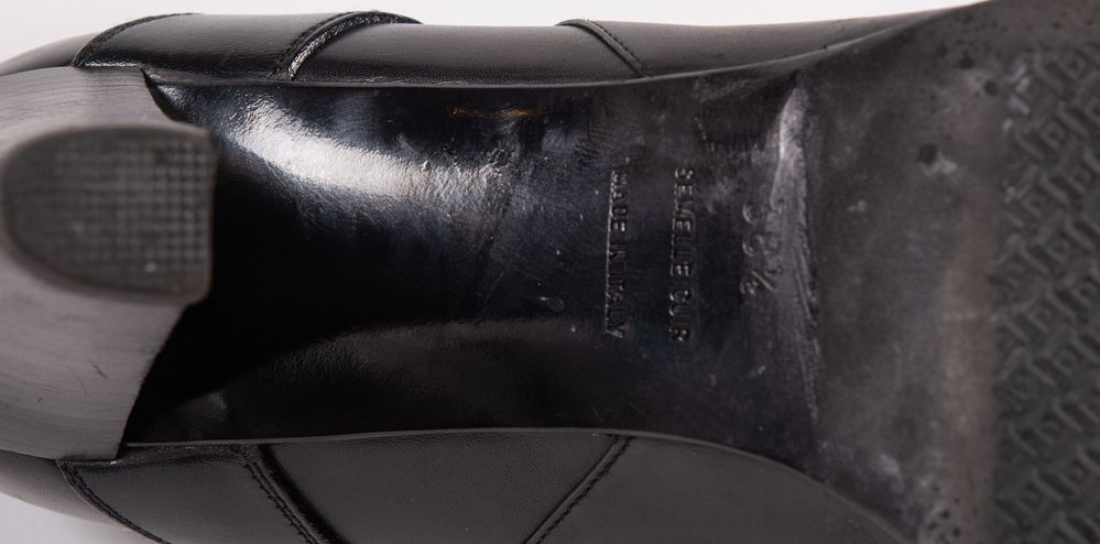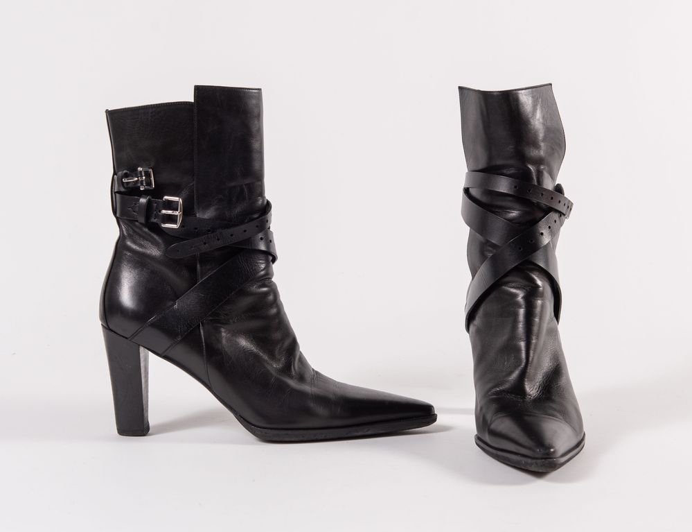 HERMÈS Stivaletti in pelle nera con tacco e dettagli della chiusura con cinturini chiusi da fibbie in metallo argentato. Riportano taglia 38,5. Altezza tacco: cm 9. Recano marchi Hermès Paris, semelle cuir Made in Italy. Corredati di dustbag e scatola originali. (Segni di usura)