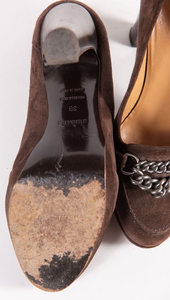 HERMÈS Decollete in pelle scamosciata marrone con dettagli a catena in metallo argentato. Riportano taglia 38. Recano marchi Hermès Paris ed Hermès. (Segni di usura)