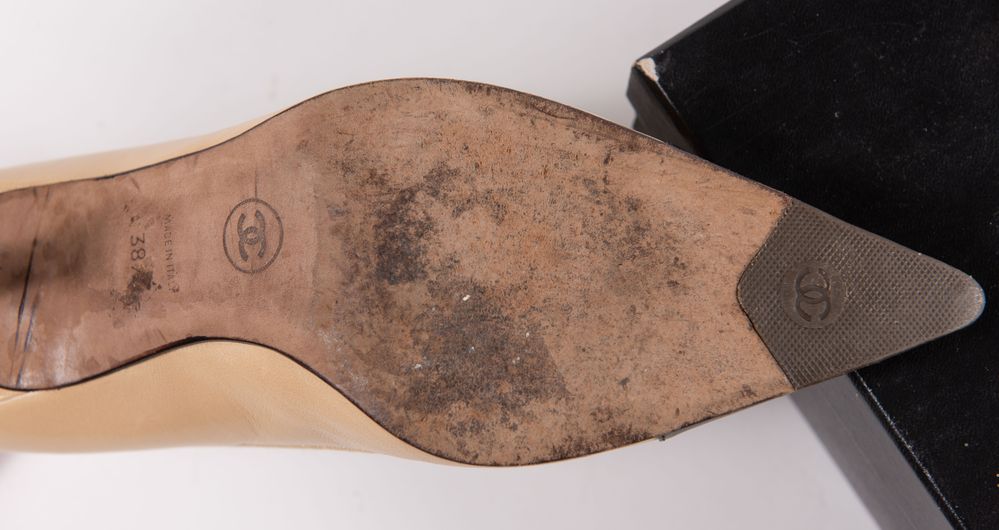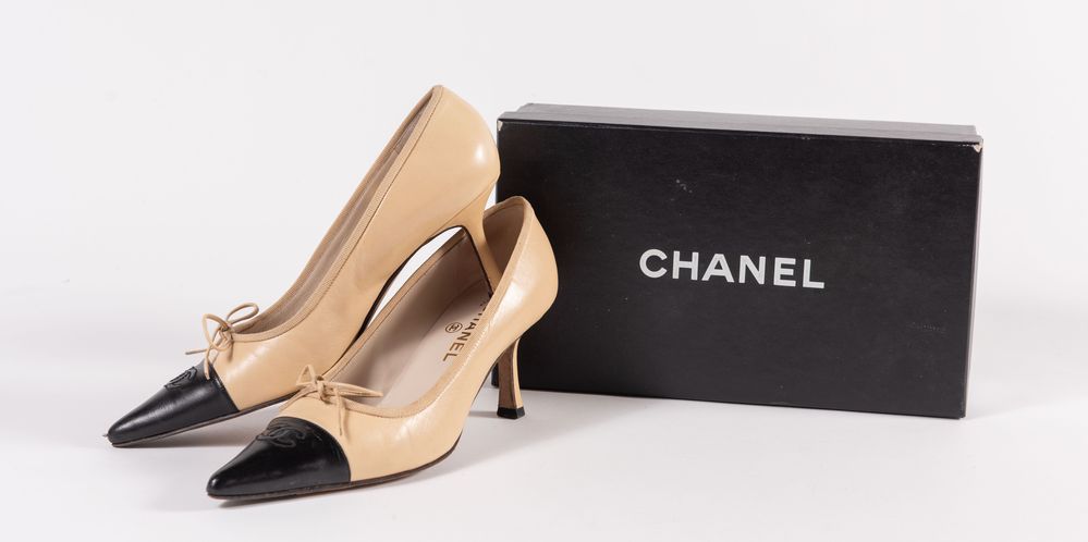 CHANEL Decollete in pelle beige e nere con dettaglio del logo sulla punta. Riportano taglia 38,5. Altezza tacco: cm 7,5. Recano marchi CC, Chanel, Made in Italy. Corredate di scatola originale. (Segni di usura)