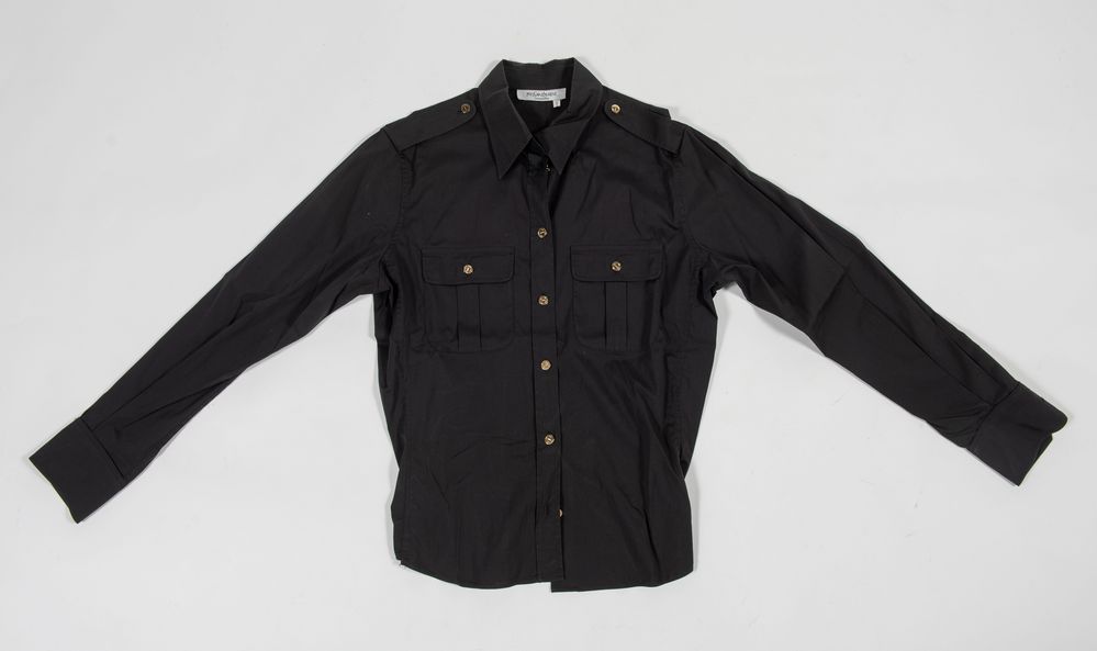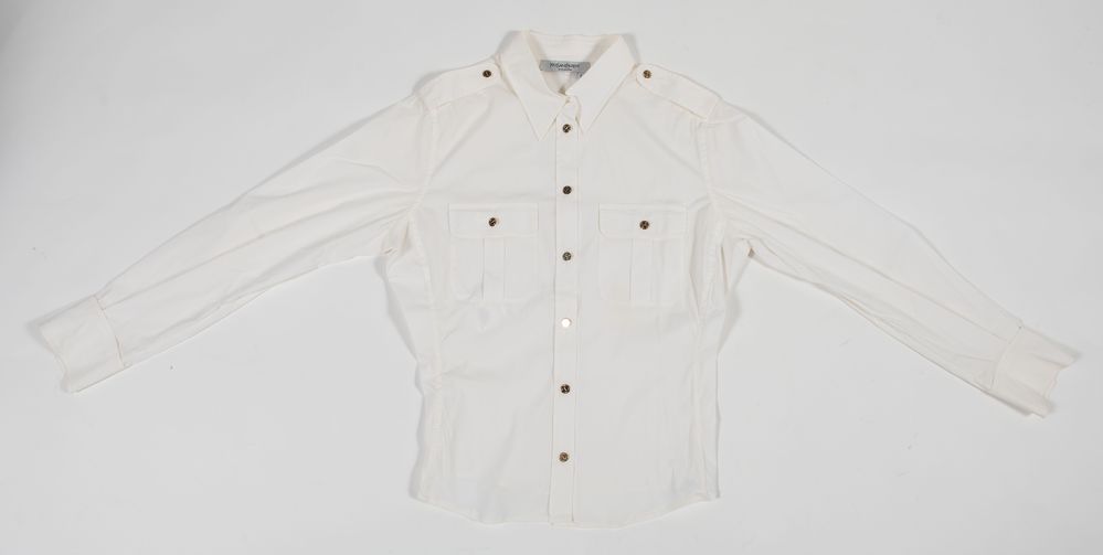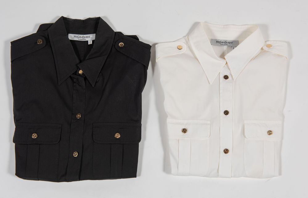 YVES SAINT LAURENT Rive gauche Lotto composto da due camicie in cotone sui toni del bianco e del nero e arrichite da bottoni in metallo dorato. Ciascuna riporta taglia 42. Composizioni: 65% cotone, 29% nylon, 6% elastane.